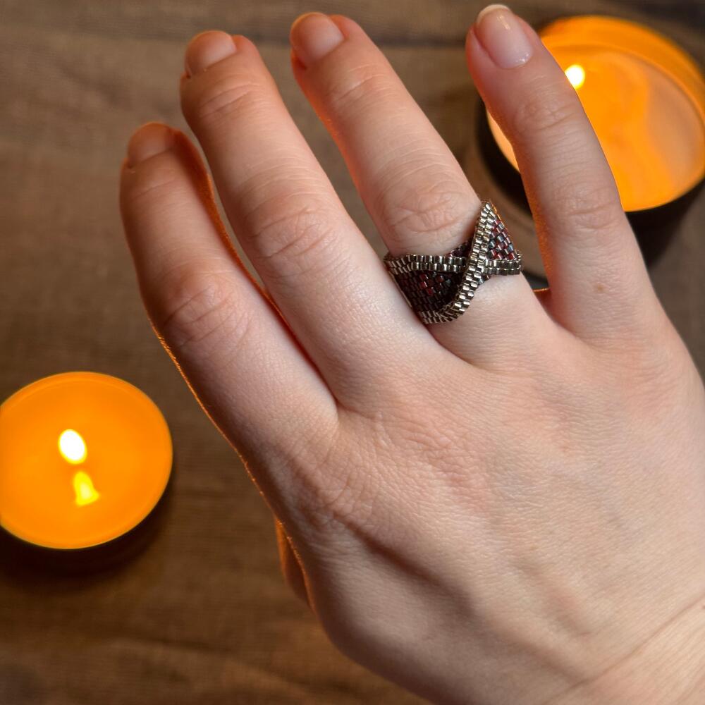 The ring is handmade from high-quality beads. It attracts attention, but it remains an unobtrusive, delicate accent in your image. The inner circumference is 59 mm