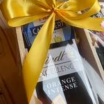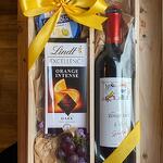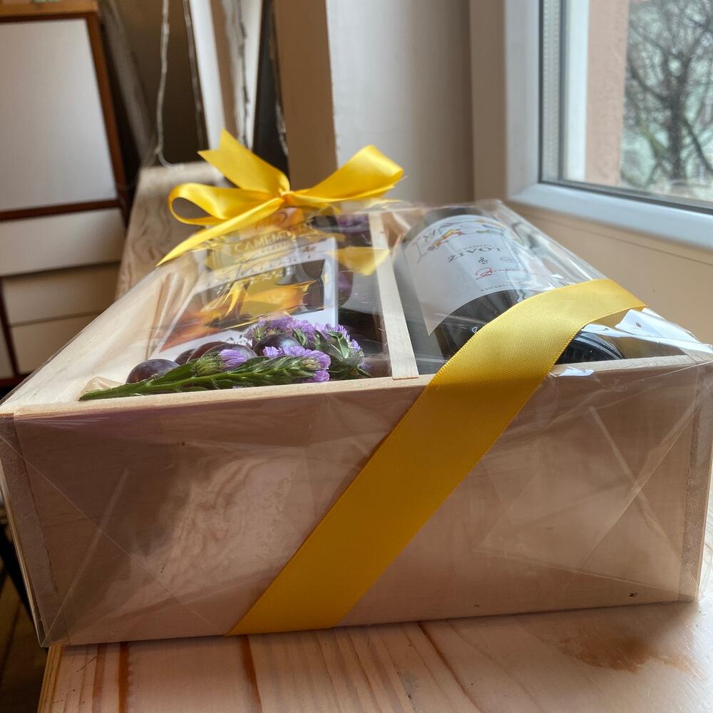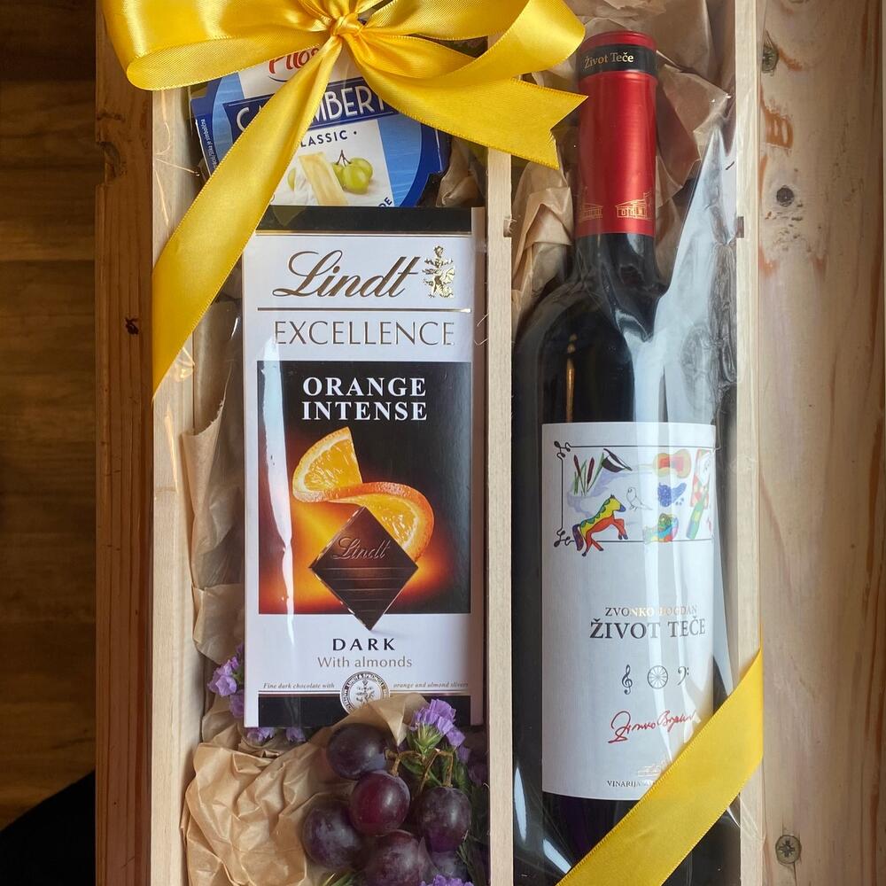 gift bag - 1 pz red wine - 1 pz signature card - 1 pz handmade wooden box - 1 pz lindt excellense chocolate - 1 pz camembert cheese - 1 pz