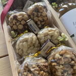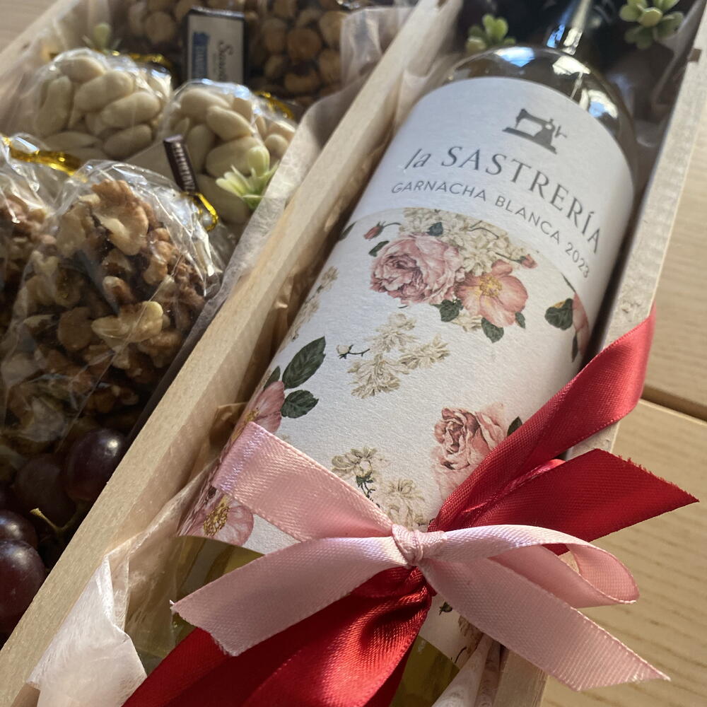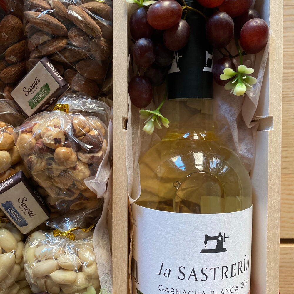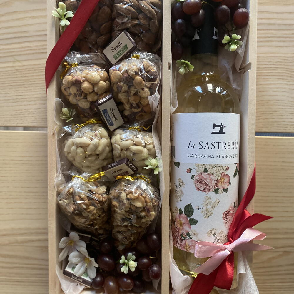 grapes - 100 g hazelnuts - 100 g wooden box - 1 pz peanuts - 100 g walnuts - 100 g mandorle - 100 g wine white - 1 pz