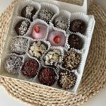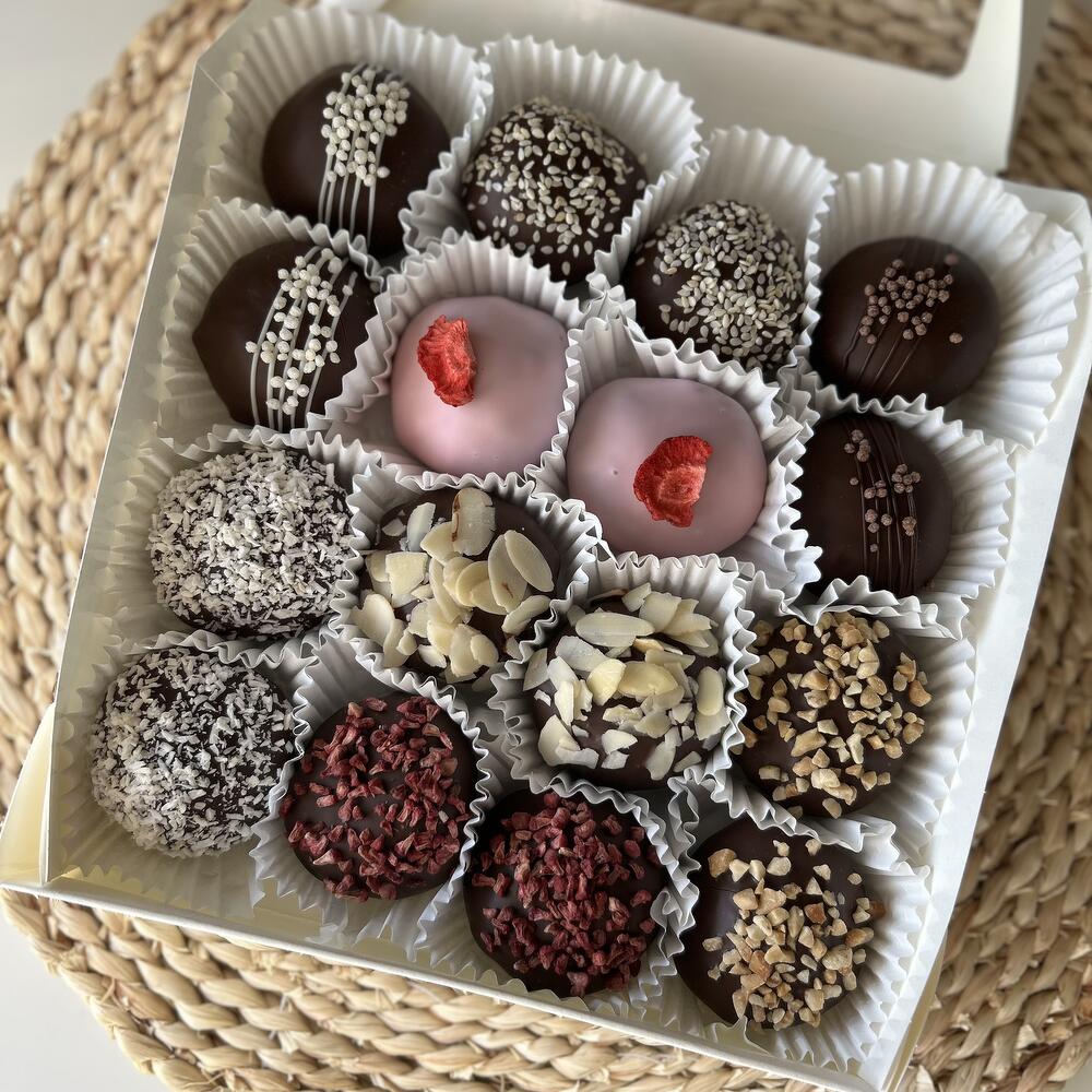 Czekolada mleczna, orzeszki ziemne, nasiona sezamu, płatki kokosowe, mąka, jajko, cukier, masło, maliny i truskawki liofilizowane.