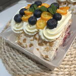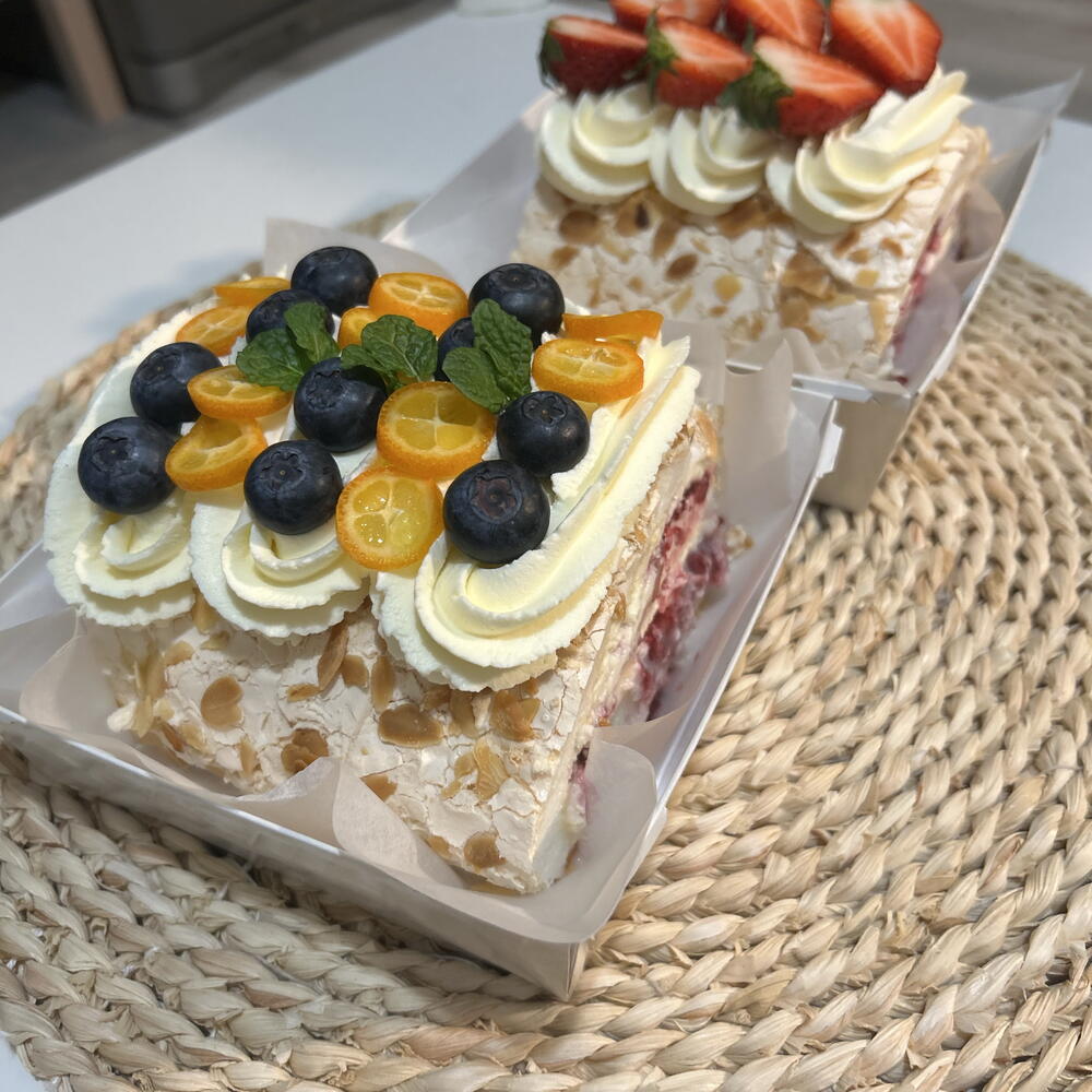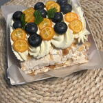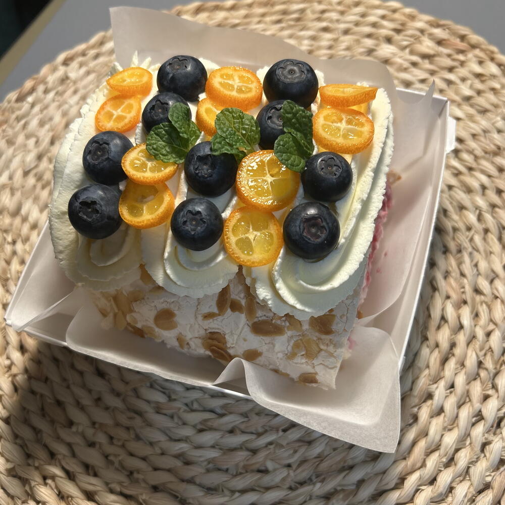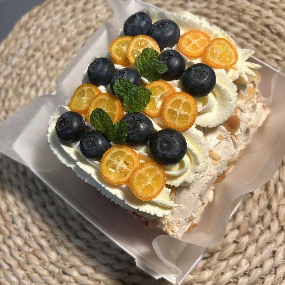 Białko jaja, cukier, mascarpone, świeże jagody(tamarin,borówka)orzech migdałowy