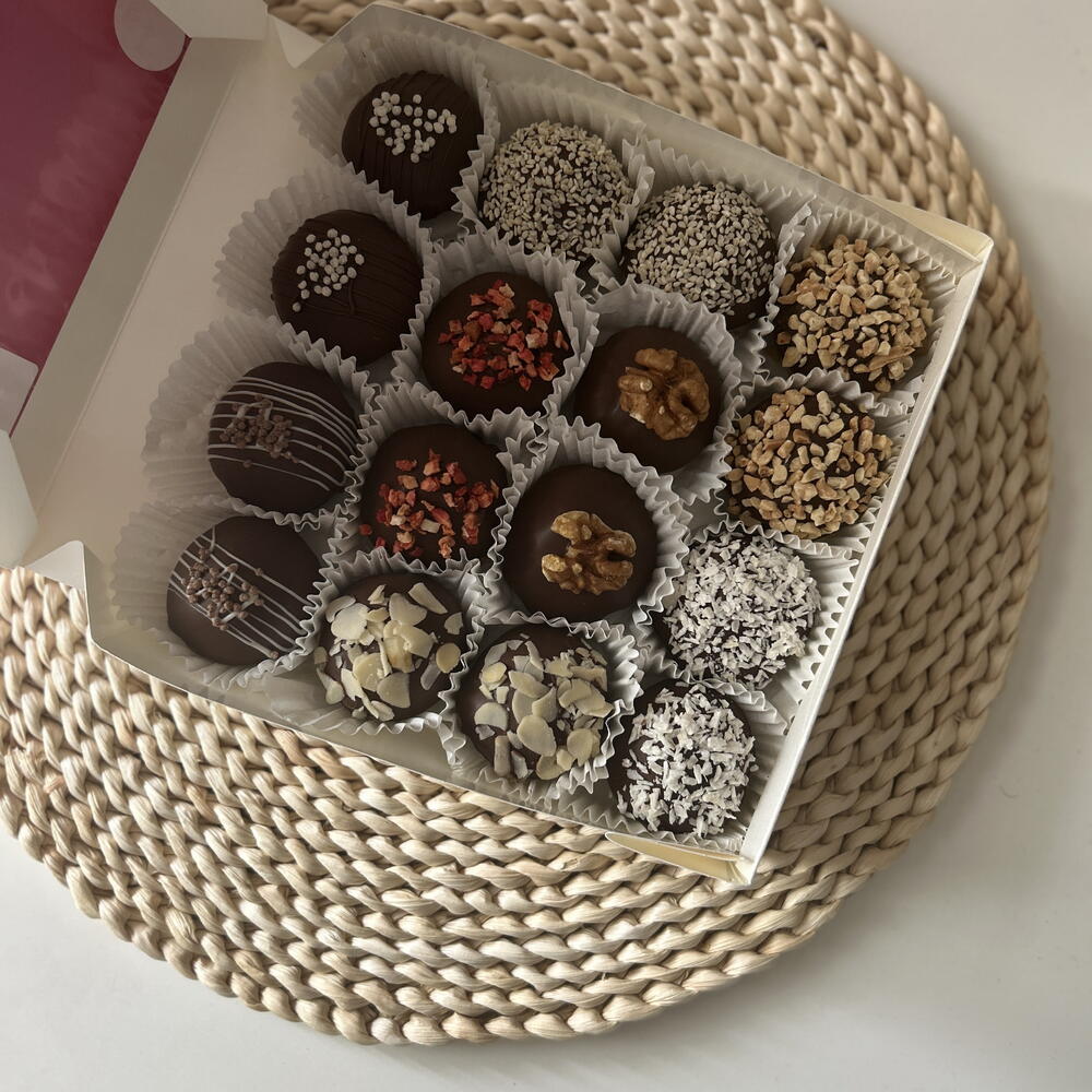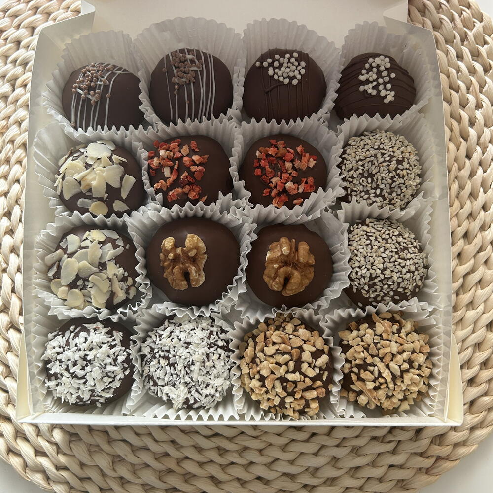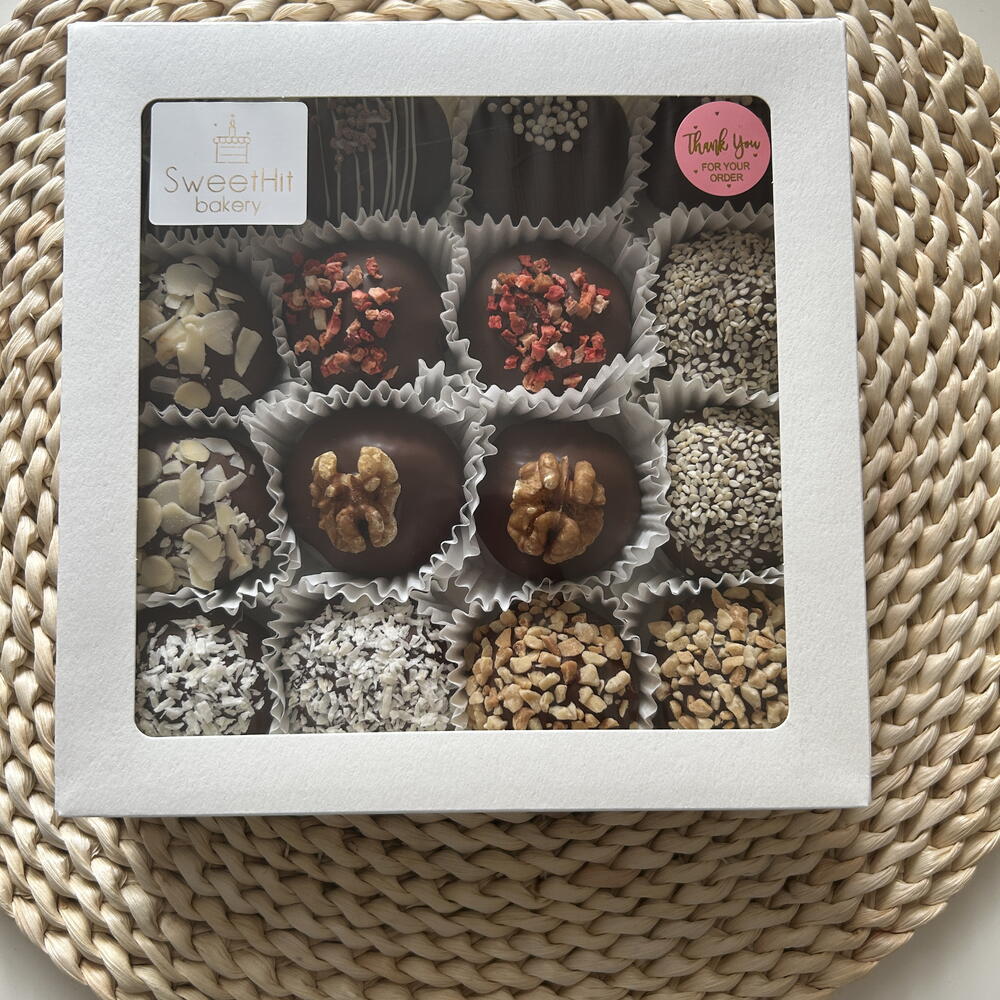 Czekolada mleczna, orzeszki ziemne, nasiona sezamu, płatki kokosowe, mąka, jajko, cukier, masło, maliny i truskawki liofilizowane, orzech włoski, migdał
