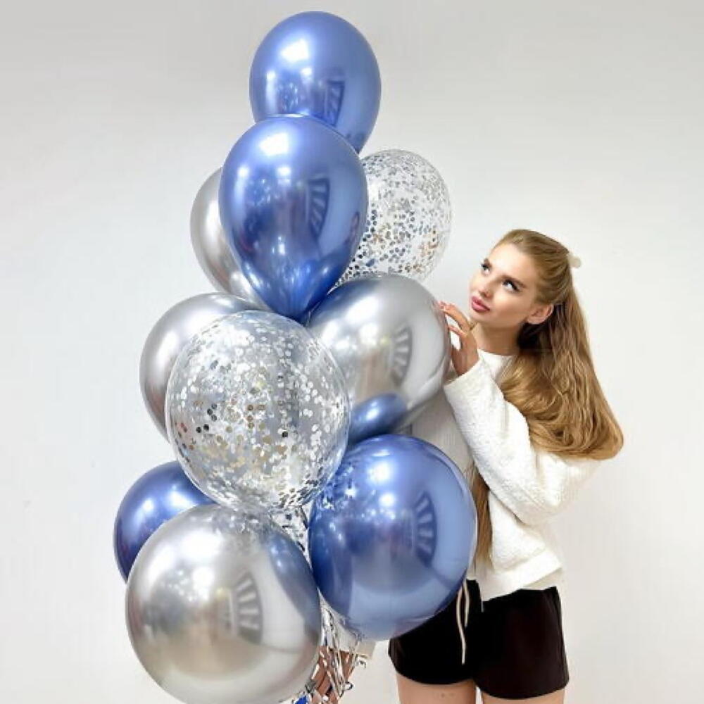 Состав фонтана из 12 шаров: 5 Латексных воздушных шара синий хром (35 см) 4 Латексных воздушных шара серебро хром (35 см) 3 Прозрачных воздушных шара с конфетти внутри (35 см)