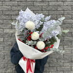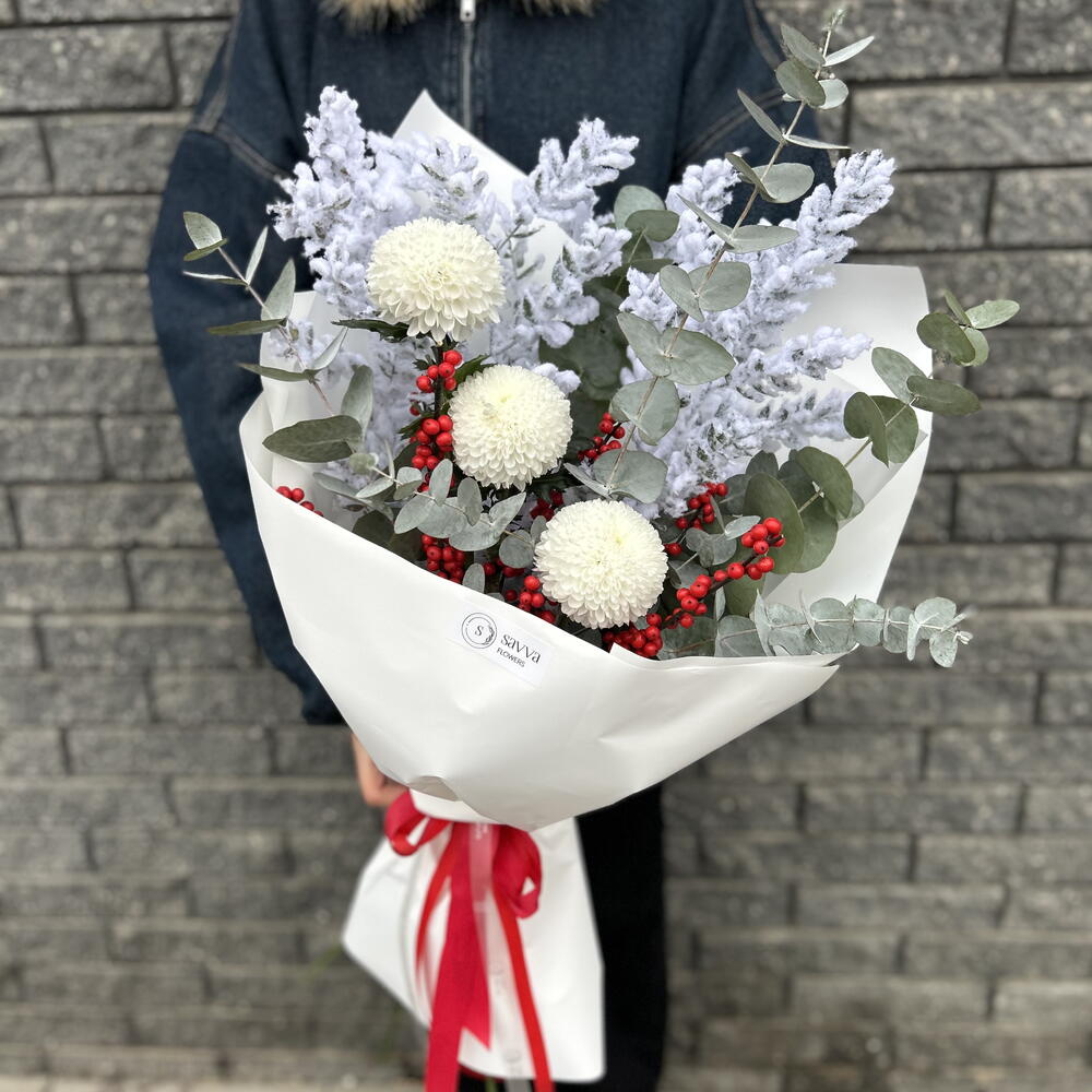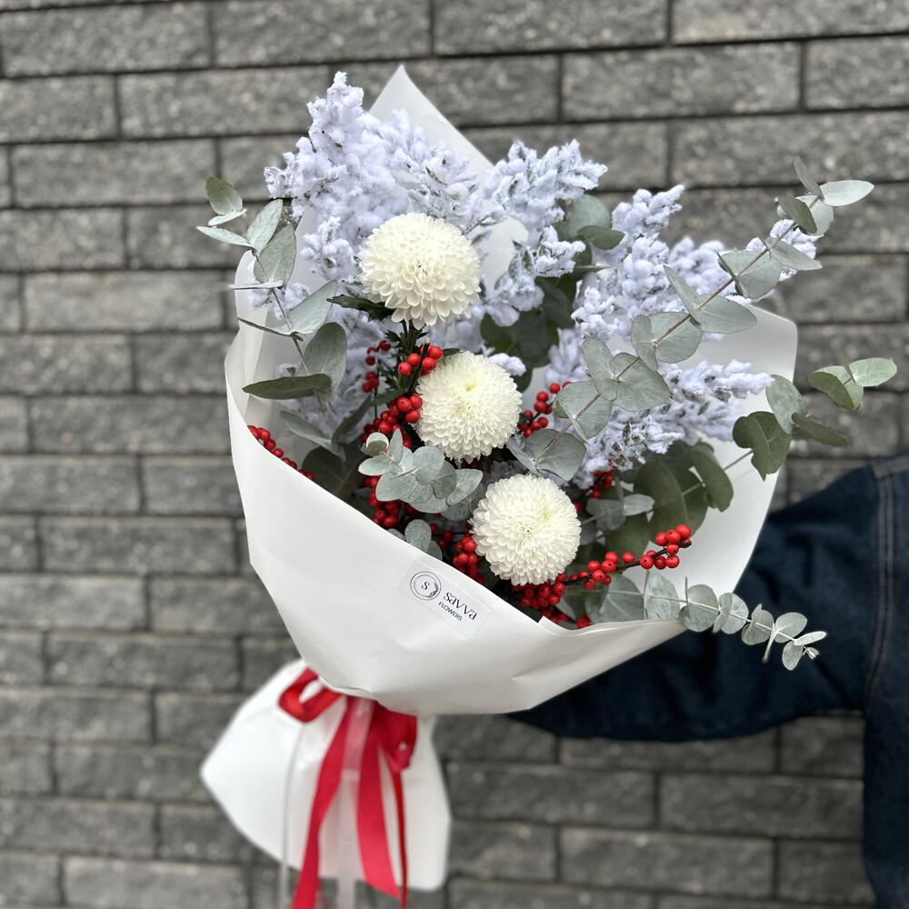 Zimowy bukiet Zorza Polarna Elegancka kompozycja w mroźnej, zimowej palecie barw. Delikatne, białe, kuliste kwiaty harmonijnie komponują się z puszystymi gałązkami pokrytymi sztucznym szronem i srebrzystymi liśćmi eukaliptusa. Jaskrawoczerwone jagody dodają świątecznego nastroju i tworzą wyrazisty kontrast. Bukiet jest umieszczony w grubym, białym opakowaniu i ozdobiony szkarłatną wstążką — dzięki temu idealnie nadaje się na prezent noworoczny, świąteczny lub po prostu na ciepłe zimowe pozdrowienia. Idealny dla osób ceniących styl, wyrafinowanie i klimat zimowej baśni.