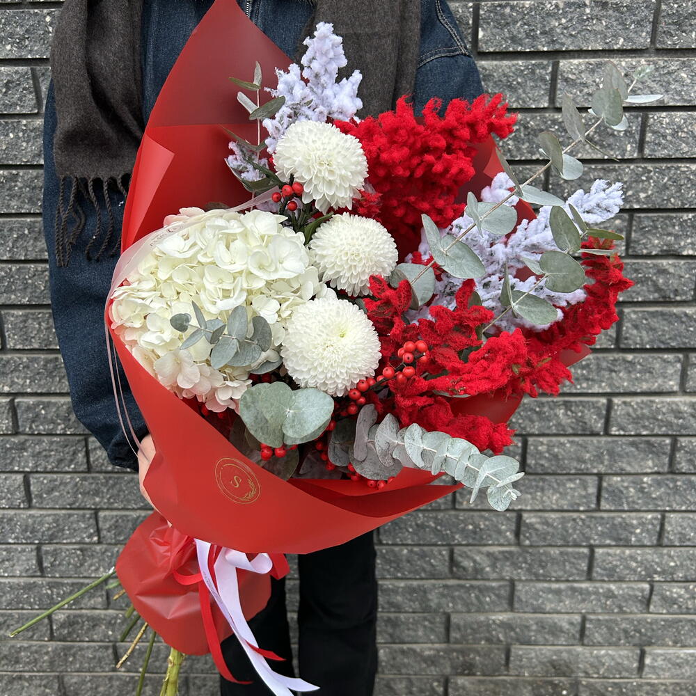 Ten wykwintny bukiet został stworzony dla tych, którzy chcą zrobić wrażenie od pierwszego wejrzenia. Jaskrawe, szkarłatne akcenty w połączeniu z delikatnymi białymi kwiatami i stylową, srebrzystą zielenią tworzą idealną równowagę między namiętnością a wyrafinowaniem. Co czyni ten bukiet wyjątkowym? Bogate czerwone akcenty dodają energii i wyrazistości; Zwiewne, białe kwiaty tworzą wrażenie miękkości i lekkości; Eukaliptus w srebrnych tonach nadaje kompozycji modny, świeży charakter; Gęste, czerwone opakowanie i wstążki podkreślają ekskluzywność i sprawiają, że bukiet jest prezentem z efektem „wow”. Ten bukiet idealnie nadaje się na wyznania, ważne okazje, wyrazy wdzięczności lub po prostu, aby uczynić czyjś dzień wyjątkowym. Stylowy, nowoczesny i wyrazisty — prezent, który pozostanie w pamięci.