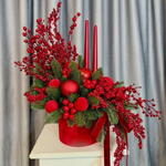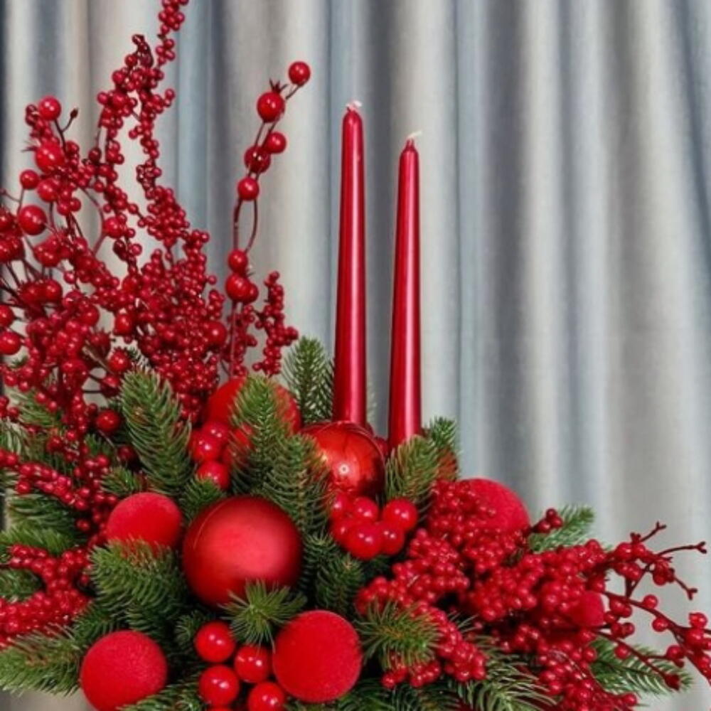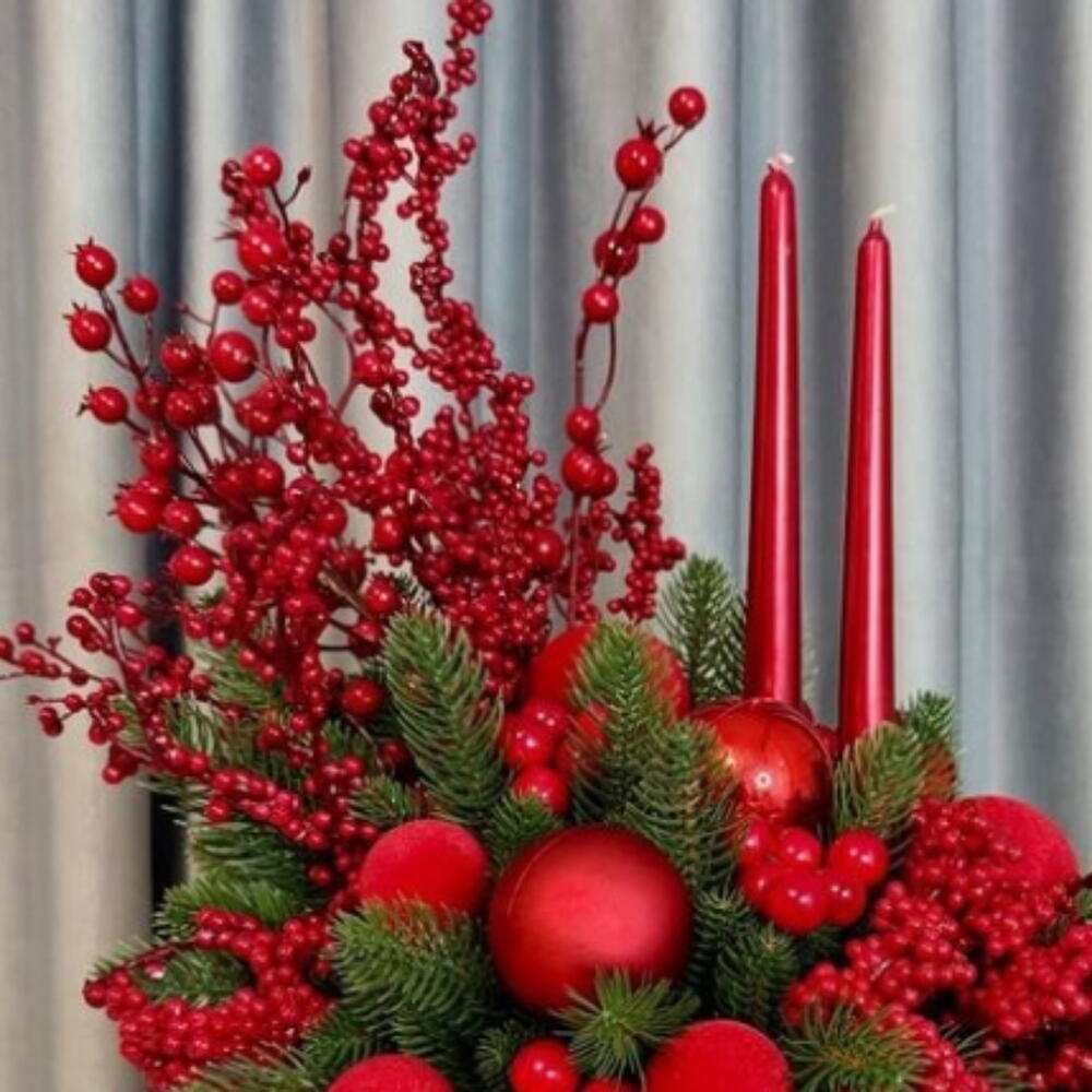 Роскошная новогодняя композиция в красных тонах ❤️ Элегантная композиция с еловыми ветками, декоративными ягодами, шарами и свечами в бархатной красной коробке. Яркий акцент для праздничного интерьера, новогоднего стола или стильного подарка с атмосферой уюта и тепла. 🎁 Идеально для Нового года и зимних праздников
