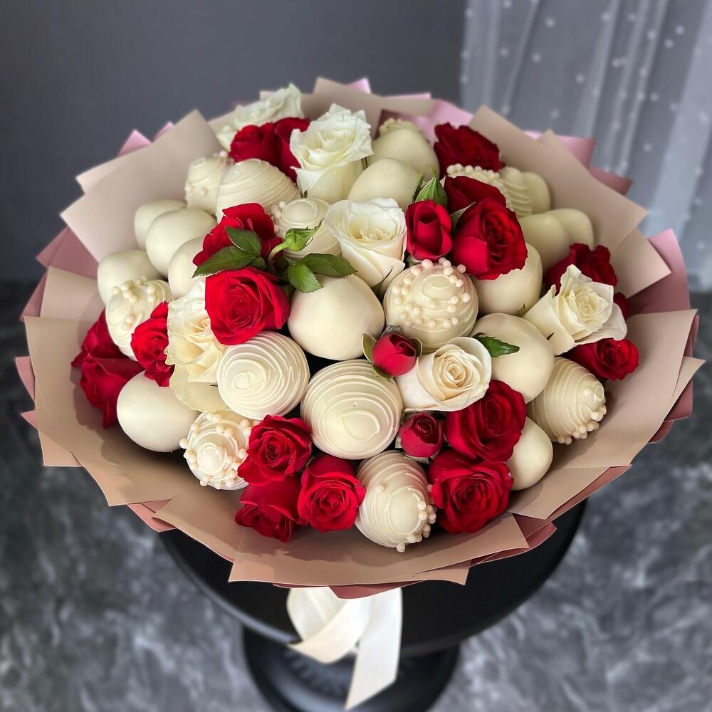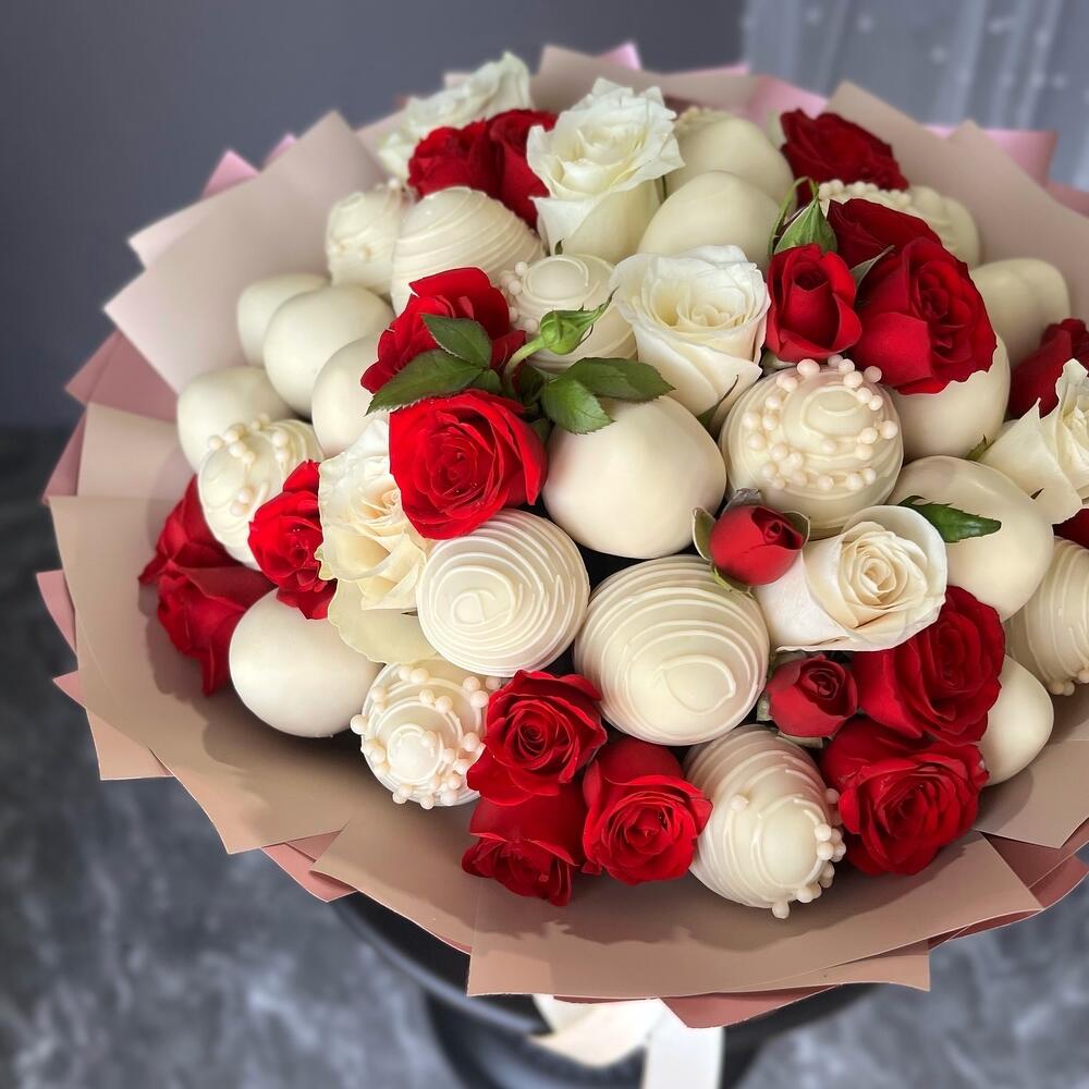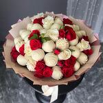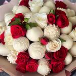Bouquet of strawberries in white chocolate with the addition of white single-headed roses and red bush roses.