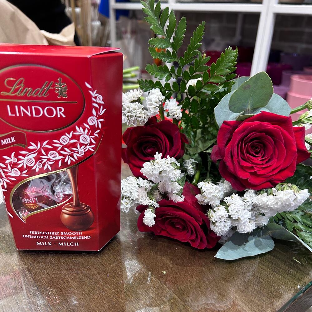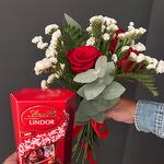 róża - 3 szt. mixed greens - 4 szt. lindt candy box - 1 szt.
