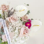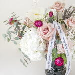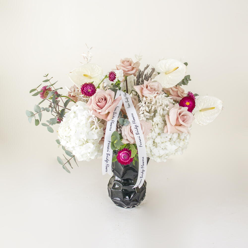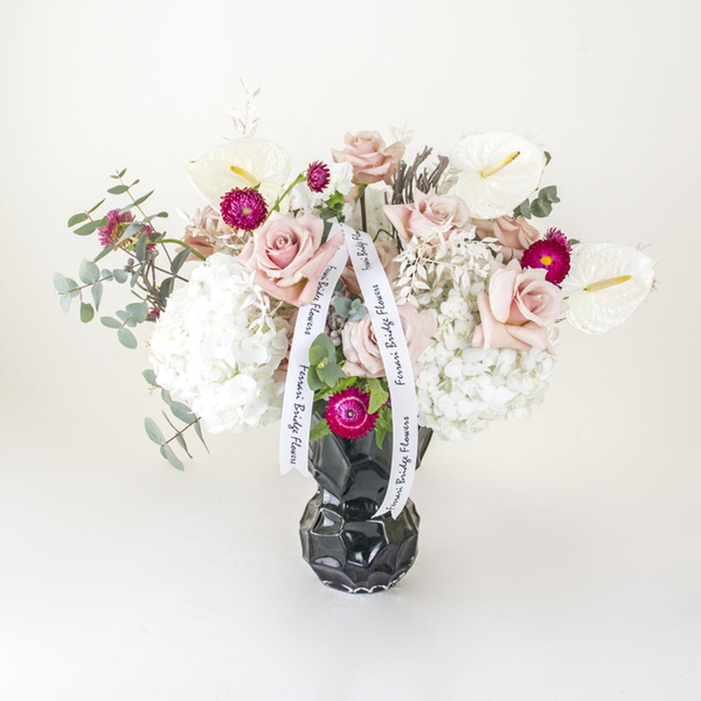 Hortensja - 2 szt. Anthurium - 3 szt. szklany wazon - 1 szt. róże - 8 szt.