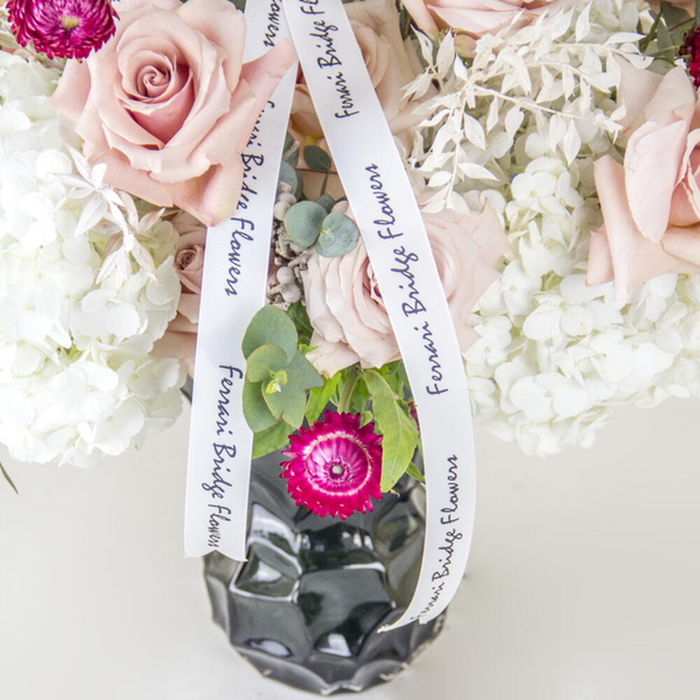 The flowers are expertly arranged with touches of textural eucalyptus and presented in a unique, dark gray glass vase with a geometric, textured surface.