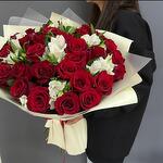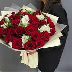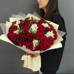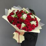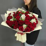 Alstroemeria - 7 szt. Роза красная - 31 szt. Ruscus - 7 szt. Wstążka satynowa - 1 szt. Opakowanie designerskie - 4 szt.
