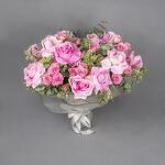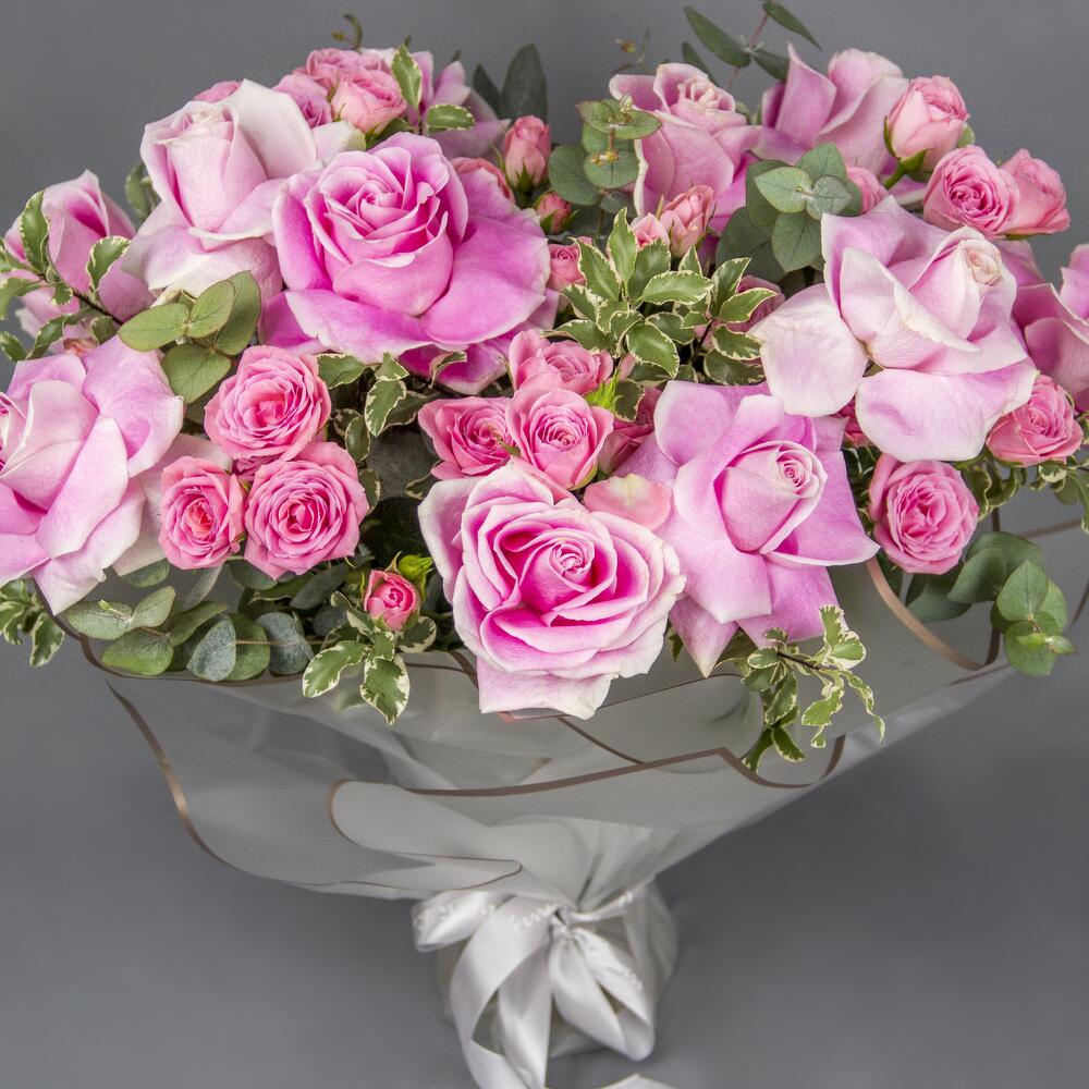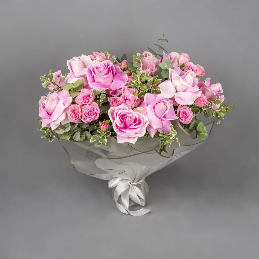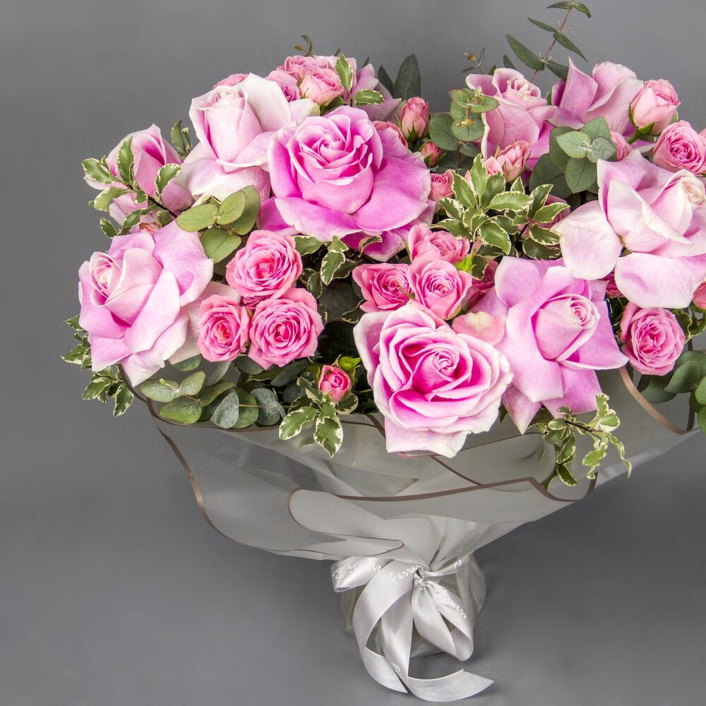 A glass vase arrangement of pink roses and spray roses with leaves wrapped with white wrapping.