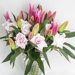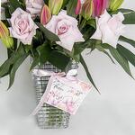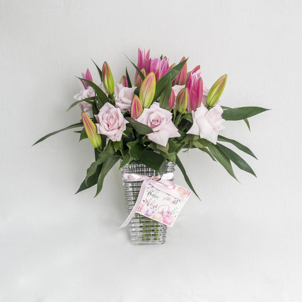 A glass vase arrangement of pink lilies and pink roses with happy mothers day card