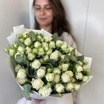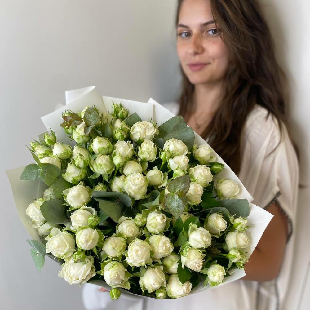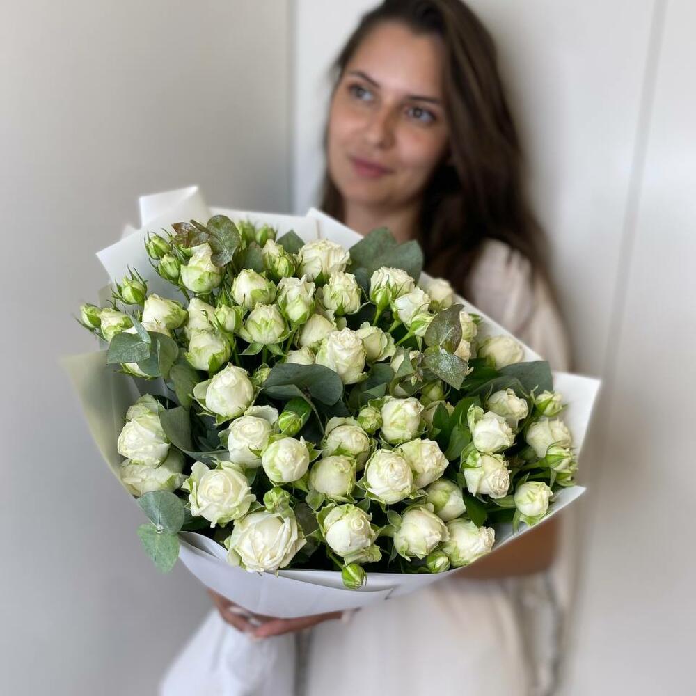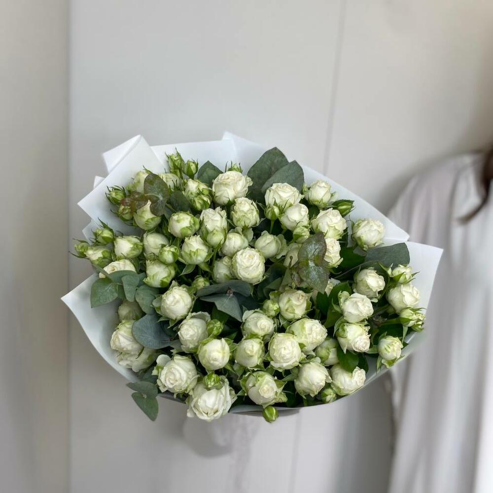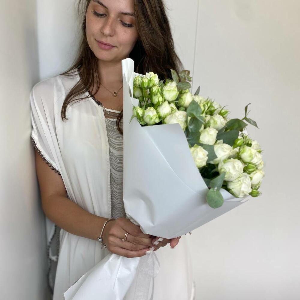Этот изысканный монобукет станет безупречным выбором для украшения любого торжества или в качестве подарка близкому человеку. Он состоит из 15 кустовых пионовидных роз белого цвета, которые воплотят нежность, почтение и любовь. Акцент в виде одного ветвистого эвкалипта придает букету особый шарм, создавая эффект укрощенной дикой природы. Весь букет упакован в со вкусом белую упаковку, подчеркивающую изысканность и элегантность композиции.
