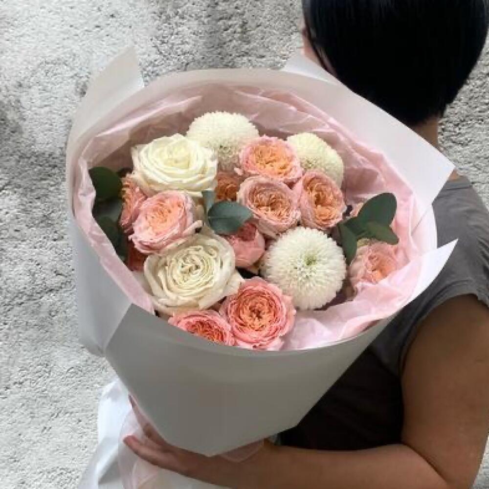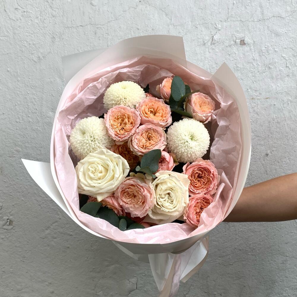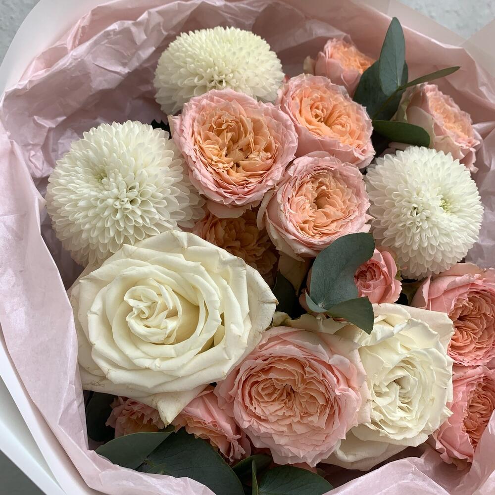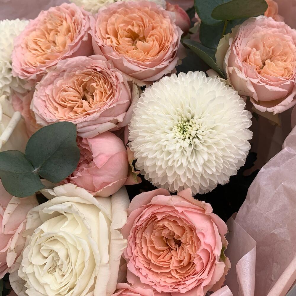 Eukaliptus - 1 szt. Róża - 2 szt. Opakowanie - 1 szt. Хризантема одноголовая - 3 szt. джульетта кустовая роза пионовидная - 3 szt.