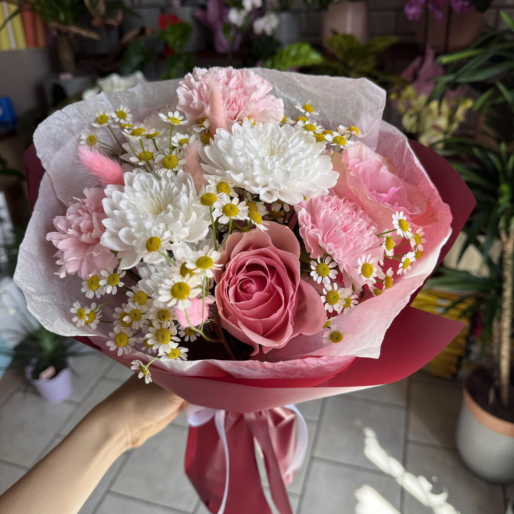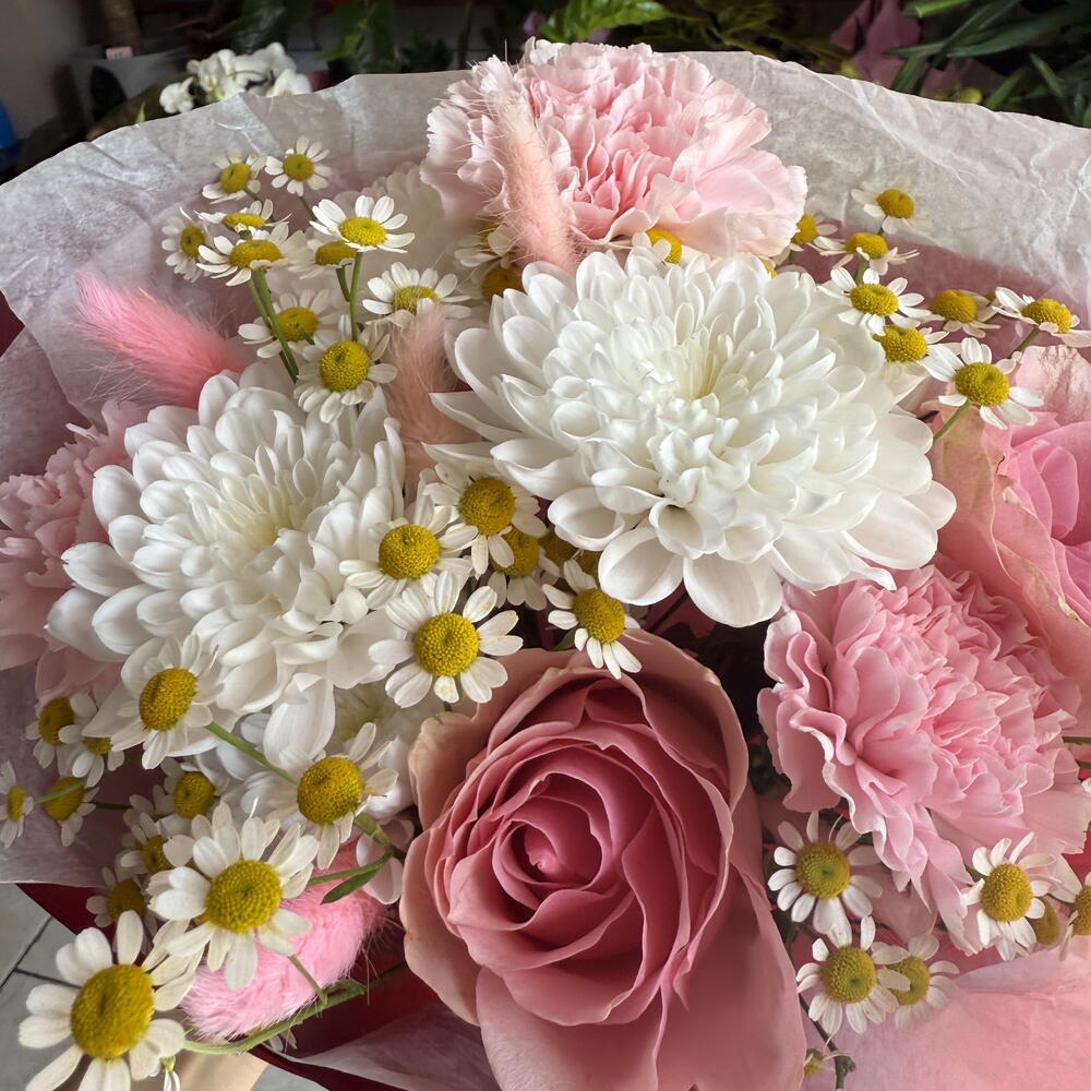 Autorski bukiet będzie prawdziwą ozdobą Twojego wnętrza lub wspaniałym prezentem dla ukochanej osoby. Kompozycja zawiera 5 eleganckich łodyg lagurus oraz 2 bujne róże, które nadają kompozycji szczególną delikatność i wyrafinowanie. Do bukietu dodano również 1 pudełko rumianków, 3 pikantne goździki i 1 uroczą stokrotkę. Wszystko to jest starannie zapakowane w 1 arkusz ozdobnego papieru, który nadaje bukietowi kompletny i stylowy wygląd.