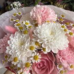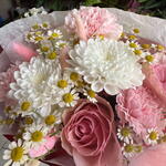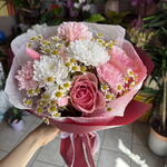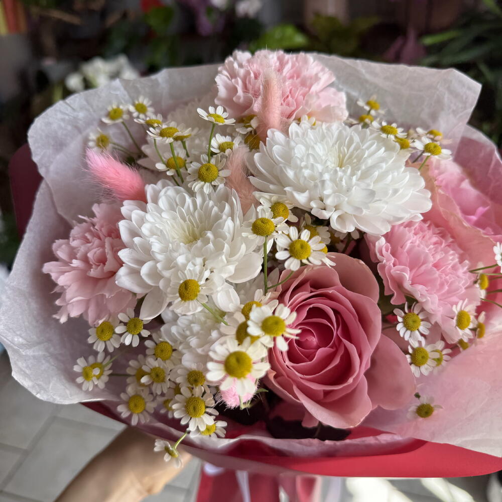 lagurus - 5 szt. róża - 2 szt. rumianek - 1 szt. goździk - 3 szt. margaretka - 1 szt. papier ozdobny - 1 szt.