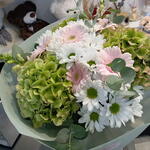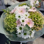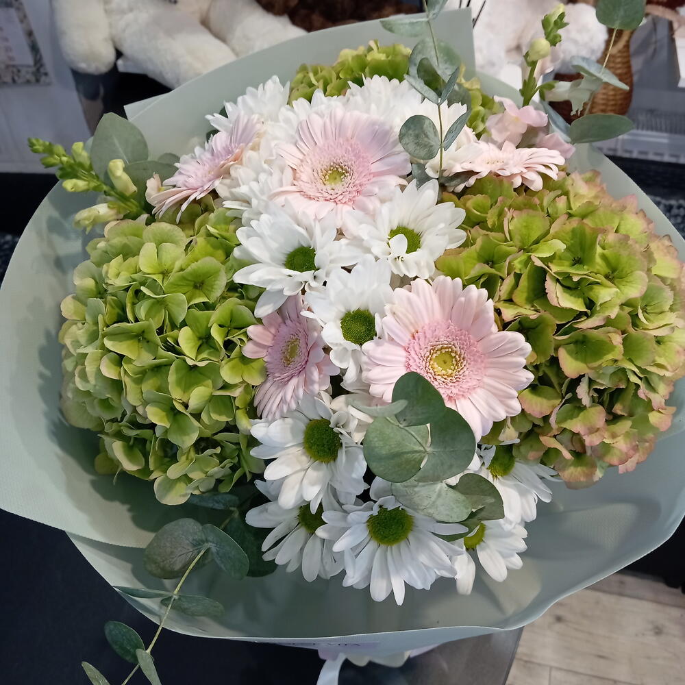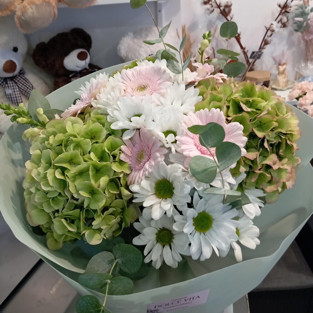 Gerbera - 6 szt. chryzantema - 3 szt. eukaliptus - 3 szt. dodatki kwiatowe - 2 szt. hortensiia - 3 szt.