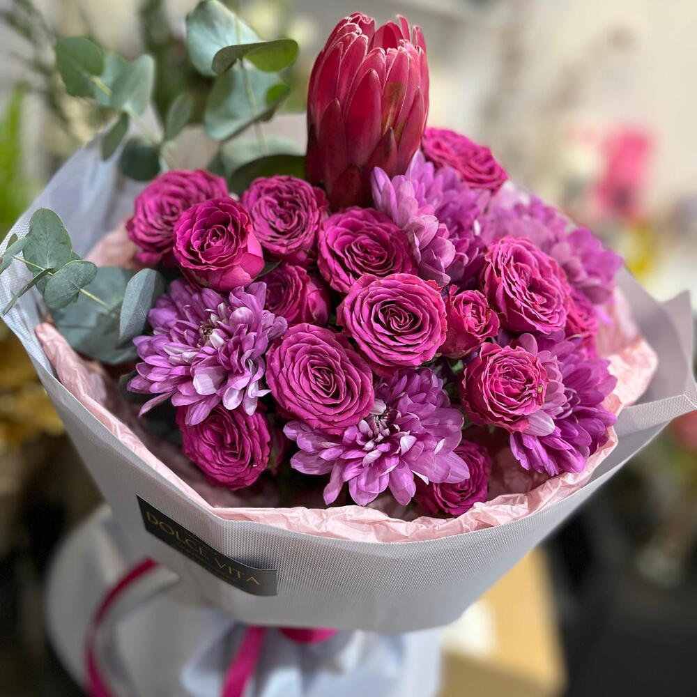 róża gałązkowa - 4 szt. proteja - 1 szt. eukaliptus - 3 szt. hryzantema mix - 2 szt.