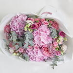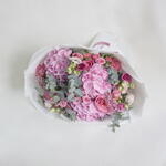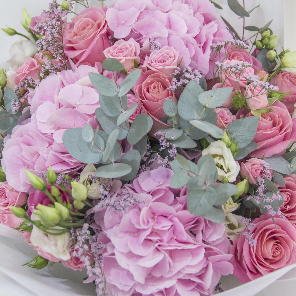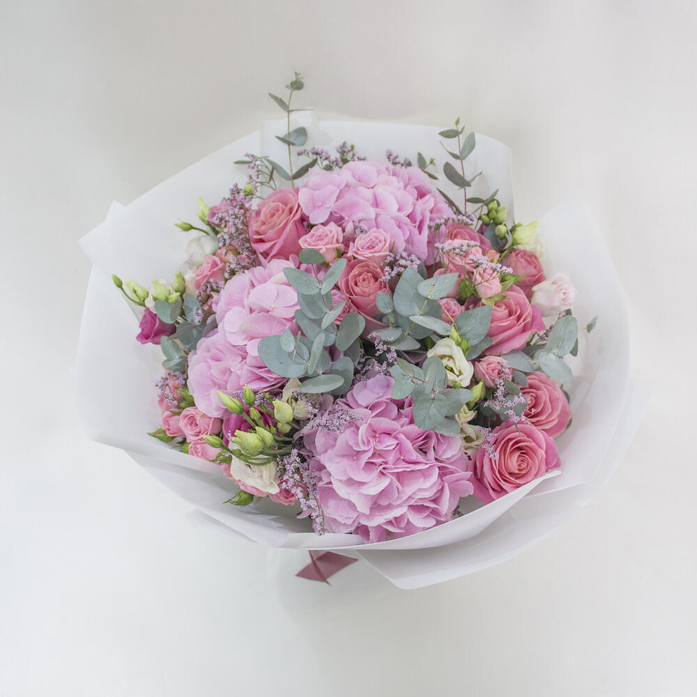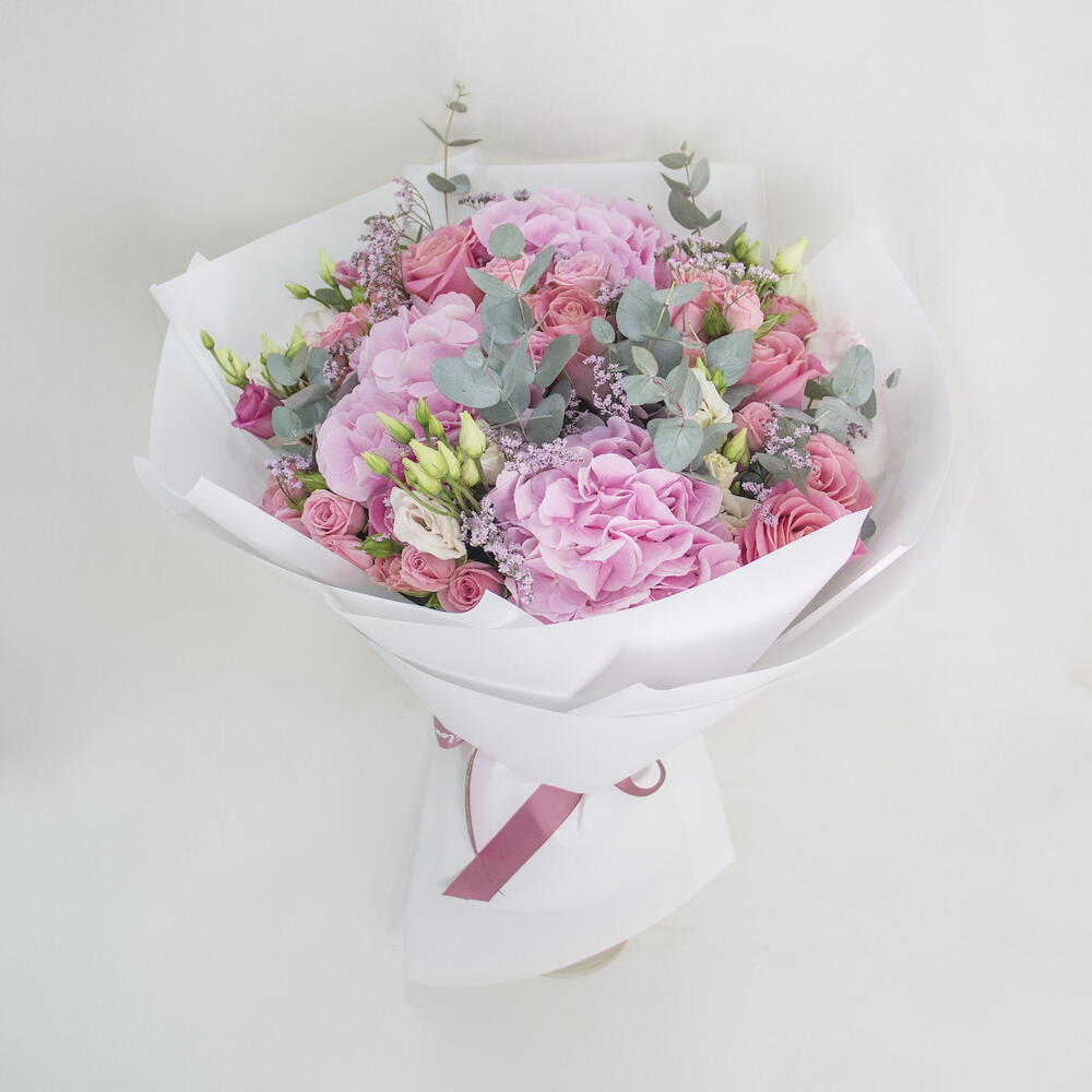 A mix of pink color bouquet with hydrangeas, roses, carnation, eustoma and eucalyptus, in a white wrapping paper with pink ribbon.
