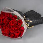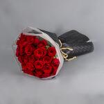 A bouquet of red Roses with black leather wrapping.