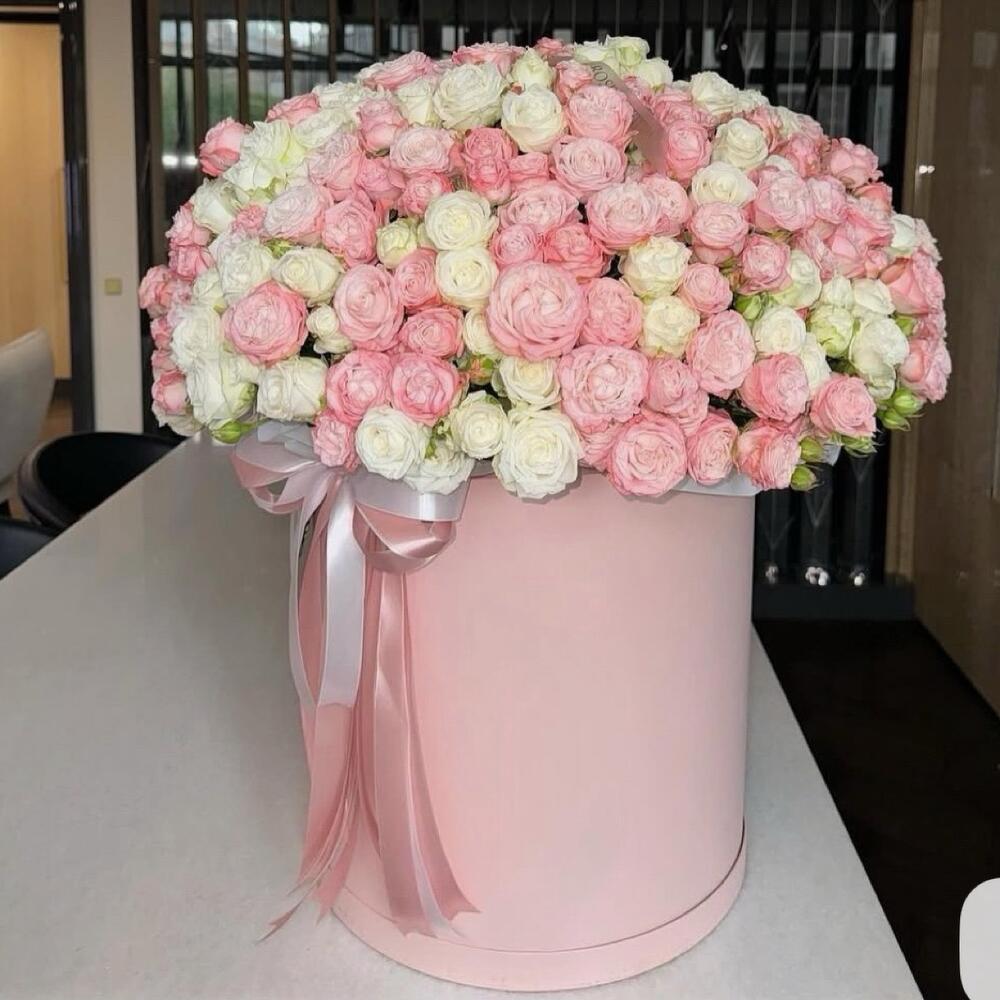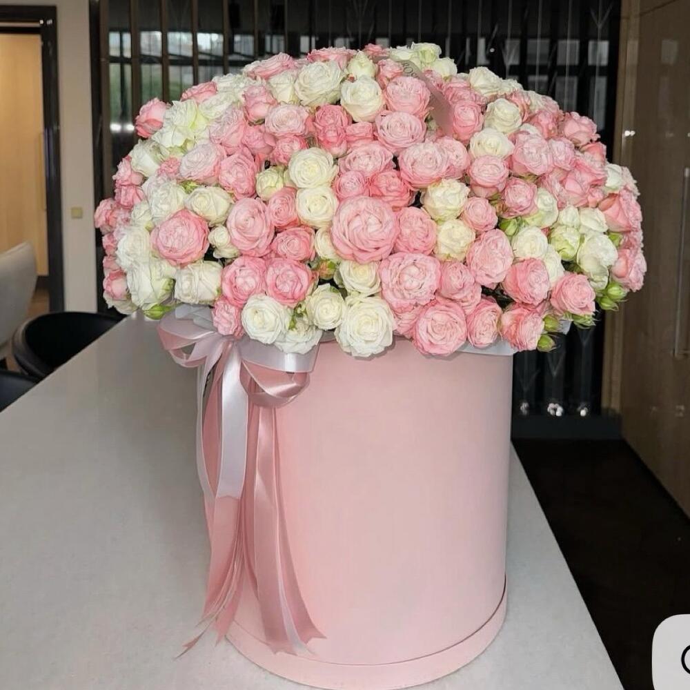 Wstążka satynowa - 1 szt. Роза пионовидная белая - 49 szt. шляпная коробка высокая - 1 szt. роза пионовидная bombastic - 50 szt.