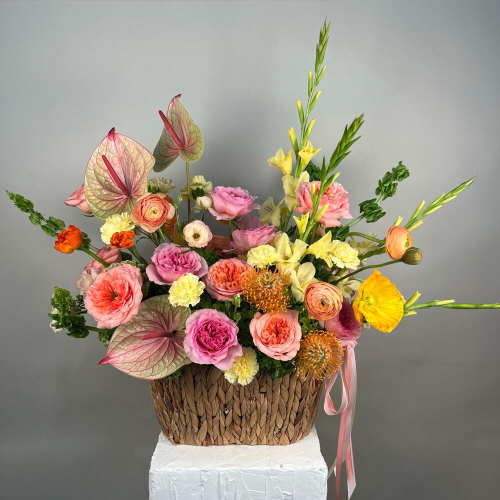 Anthurium - 3 szt. goździki - 10 szt. ranunculus - 7 szt. Róża David Austin - 8 szt. mak - 5 szt. róża ogrodowa premium - 9 szt. hortensja - 9 szt. jaskier motyl - 5 szt. mieczyki - 5 szt. igielniki - 4 szt.