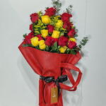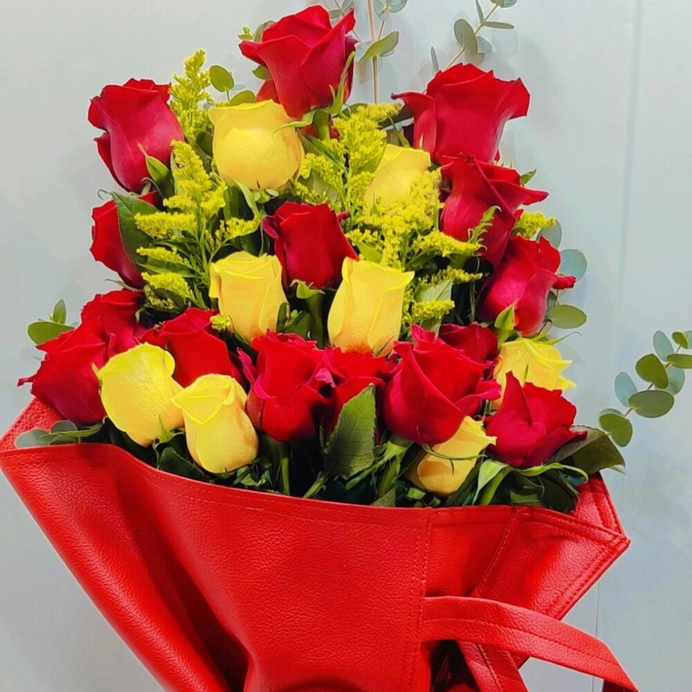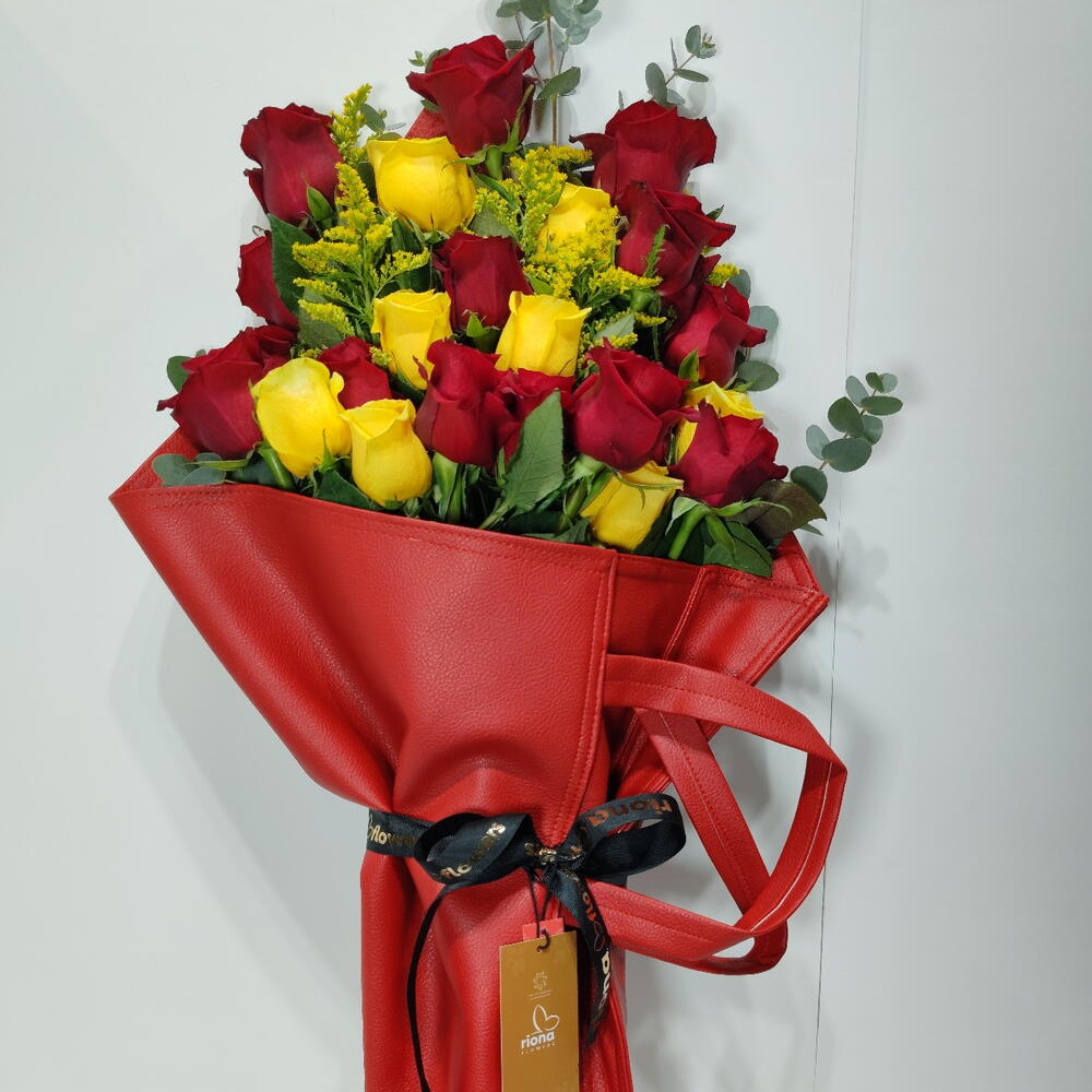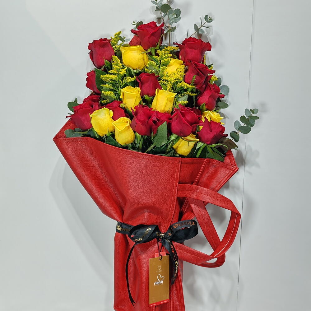 Leather hand bouquet arranged with red and yellow roses together solidago and eucalyptus suits any occasions