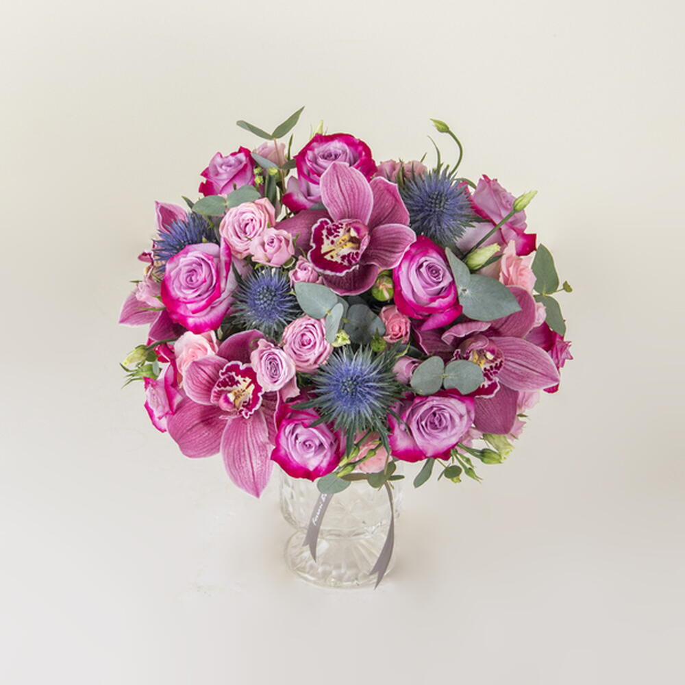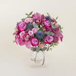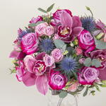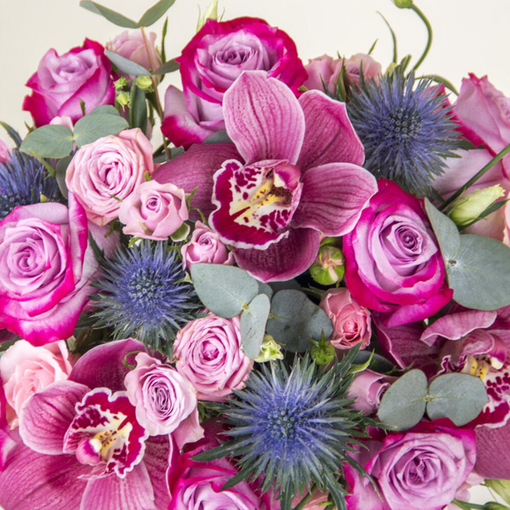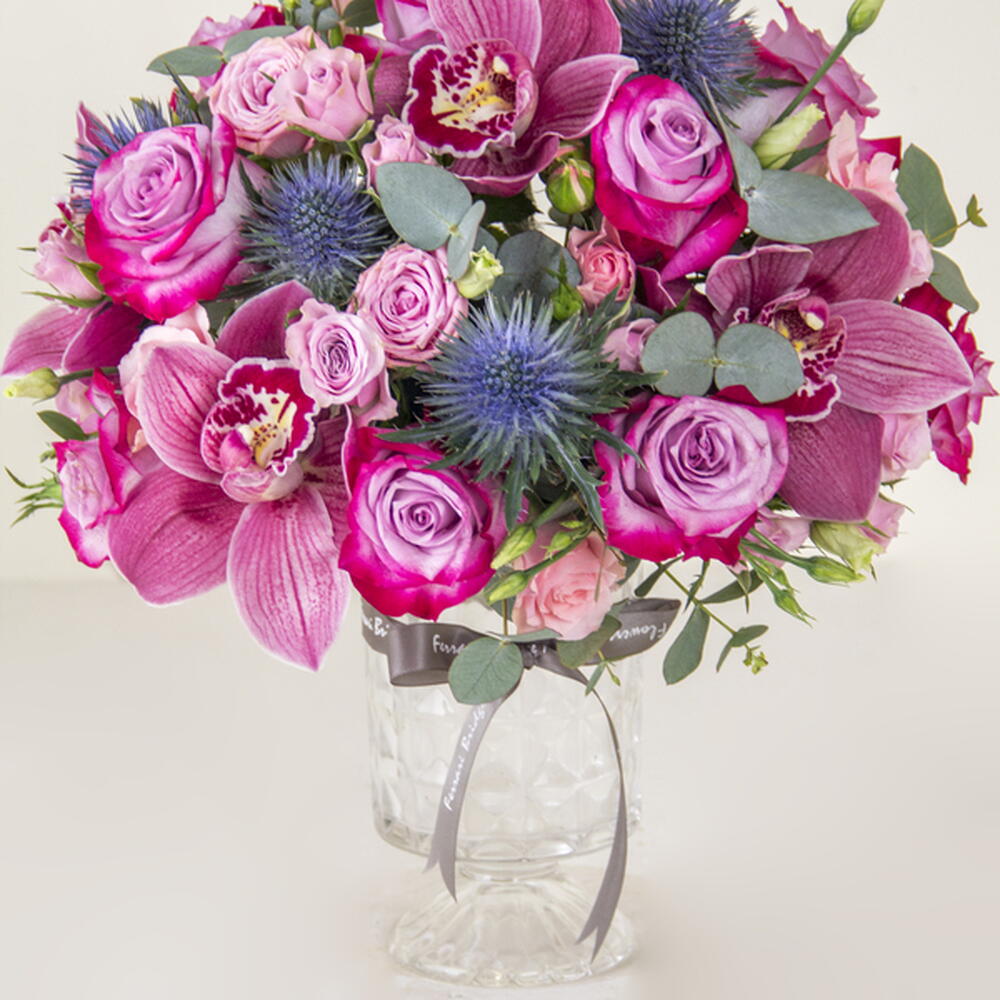This captivating centerpiece showcases a vibrant mix of magenta roses and orchids, accented with striking blue thistles and touches of eucalyptus, creating a visually rich and modern display.