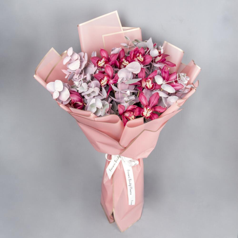 Wstążka - 1 szt. Eukaliptus - 10 szt. Pakowanie - 4 szt. cymbidium bloom - 10 szt.