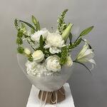 Experience the true essence of floral beauty with this exclusive Florists Specials bouquet. Composed with a whimsical blend of 2 vibrant Snapdragons and 2 gorgeously bright Lilies, it exudes an enchanting charm. The bouquet is full of contrast, with 3 pristine white Peonies, adding to its grace. What further elevates its charm is the addition of 2 lush Hydrangeas and 5 delicate white Roses, manifesting an air of pure elegance. The finishing touches are the charming 2 Irish Bells and 2 Star of Bethlehem. This creation encapsulates elegance and charm, designed to delight any flower enthusiast or perfect as a heartwarming gift for a loved one.