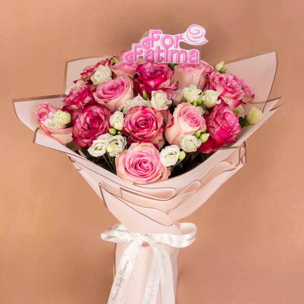 A hand-tied bouquet of Roses and Lisianthus in Strawberry Sorbet tones.