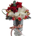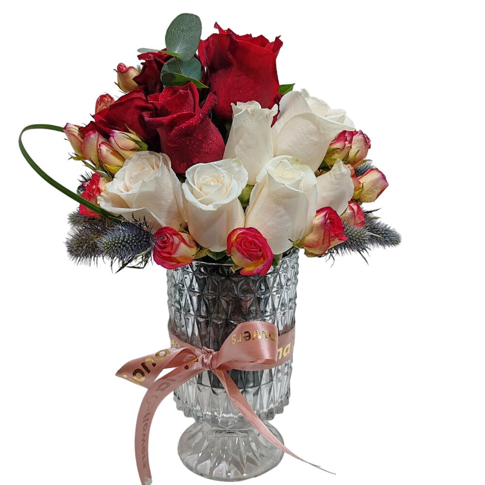 Simple vase with red and white roses with elingium and spyar roses arranged with eucalyptus
