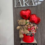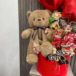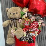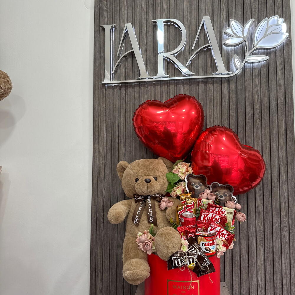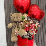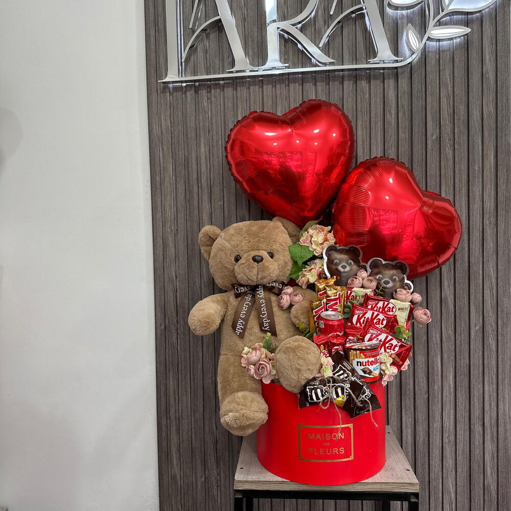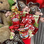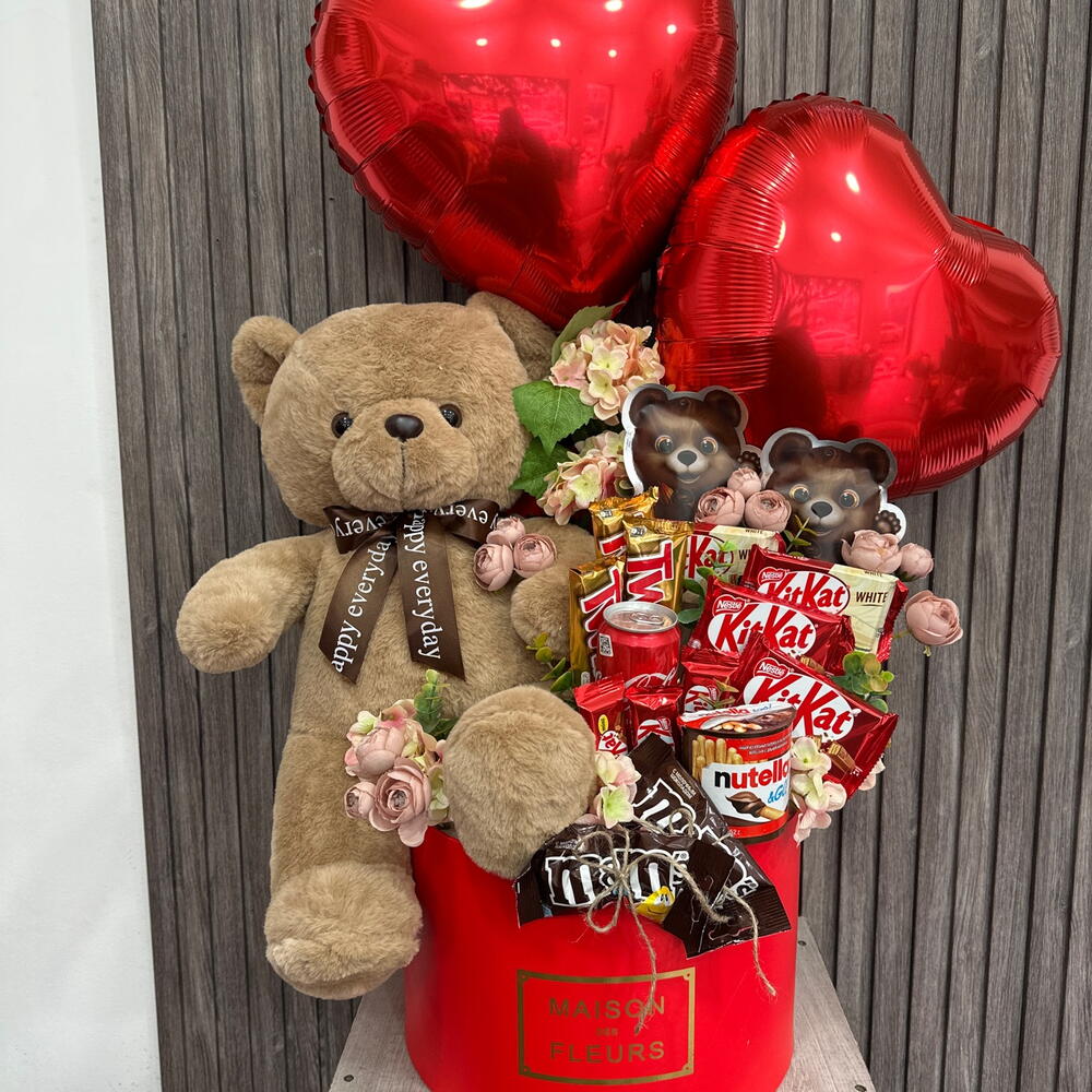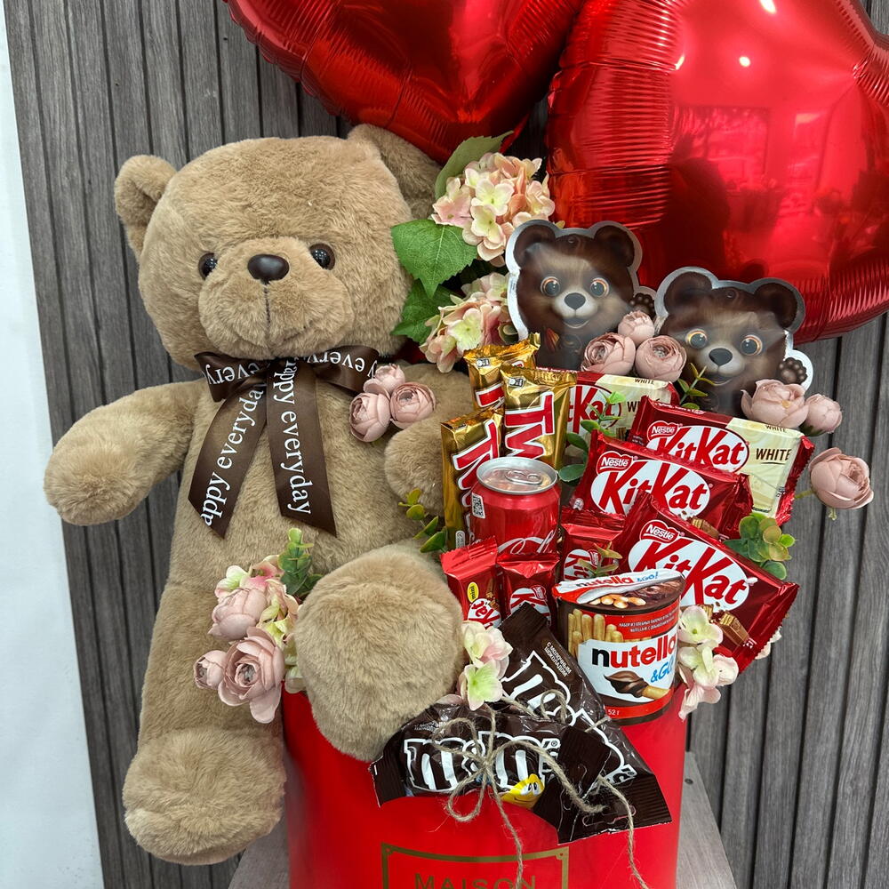 Pudełko kapeluszowe - 1 szt. Твикс - 3 szt. Coca Cola - 1 szt. Nutella go - 1 szt. искусственные цветы - 10 szt. конфеты драже - 2 szt. мэмэмденс - 2 szt. мишка коричневая 40см - 1 szt. фольговое сердце - 2 szt. разные кит кат - 10 szt.