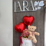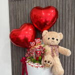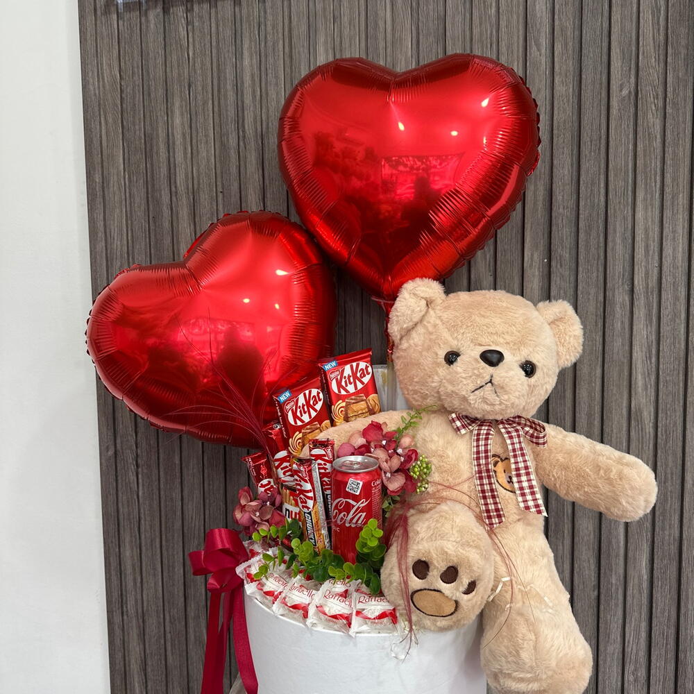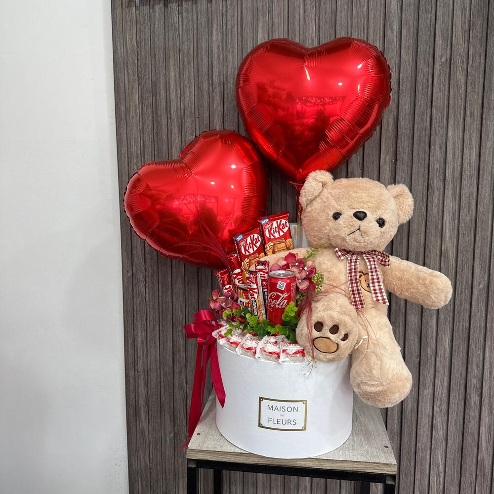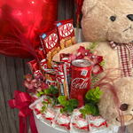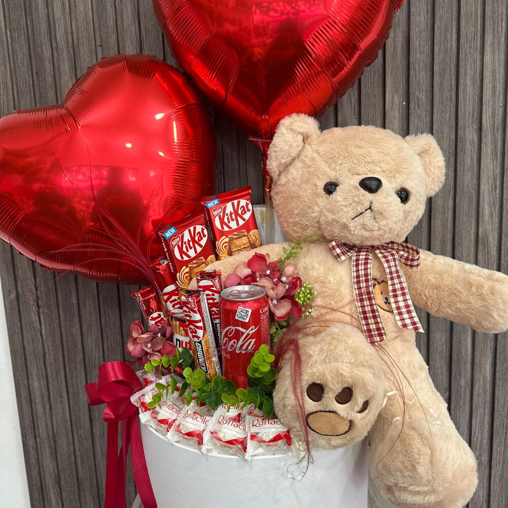 Raffaello - 8 szt. Pudełko kapeluszowe - 1 szt. искусственные цветы - 10 szt. мишка 40 см - 1 szt. кит кат плитка - 2 szt. нутелла го - 1 szt. разные киткаты - 2 szt. кока кола в банке - 1 szt. шары фольговые - 2 szt. кит кат каунтри - 2 szt.