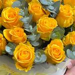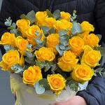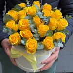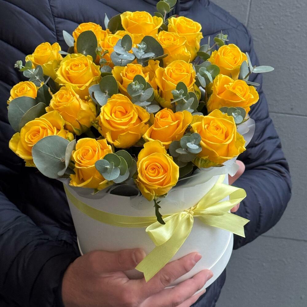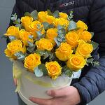 Роза желтая - 19 szt. Eukaliptus - 10 szt. Pudełko - 1 szt. Wstążka satynowa - 2 szt. биофлор - 1 szt.