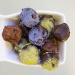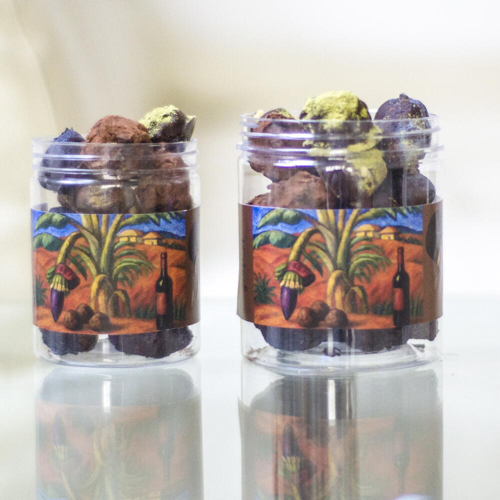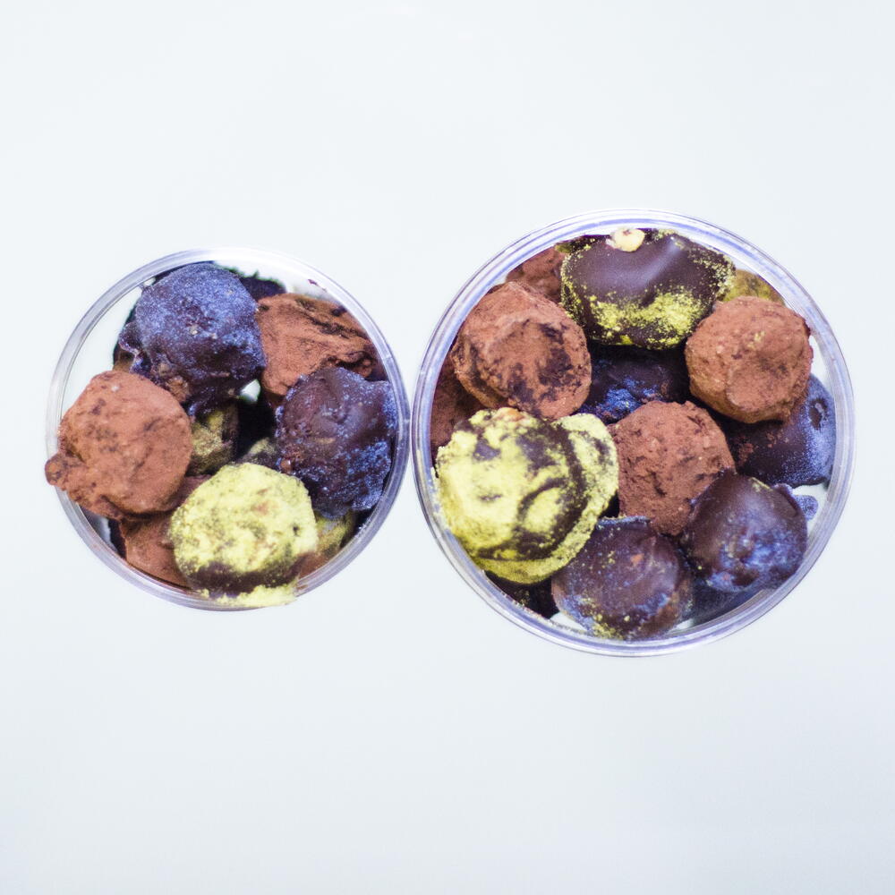 Our truffles are a small chocolate gallery where each taste is a separate miniature with its own character, mood and story. There are even more of these stories in the big jar of TRY THEM ALL - XL: This is a whole collection for those who love variety and want to try everything. We create fillings based on white, milk and dark chocolate, adding herbs, spices, teas, fruits, and other natural ingredients that inspire us right now. Tastes can change from batch to batch, we are constantly experimenting. But one thing remains unchanged: it is always very tasty. On the outside, each truffle is covered with a thin layer of chocolate and decorated with cocoa crumbs, nuts, blue, green matcha or other sprinkles. Thats why they have such a bright, almost gallery-like look, as if each truffle was specially created to surprise. It is a special pleasure in the evening, sitting at the table, to cut a truffle into several pieces and guess what is hidden inside: a fresh citrus note, a spicy hint of tea, soft caramel or an unexpected spice. A large XL jar is an ideal option for those who want to taste all the flavors, share the pleasure with friends or just allow themselves a little more chocolate happiness.