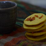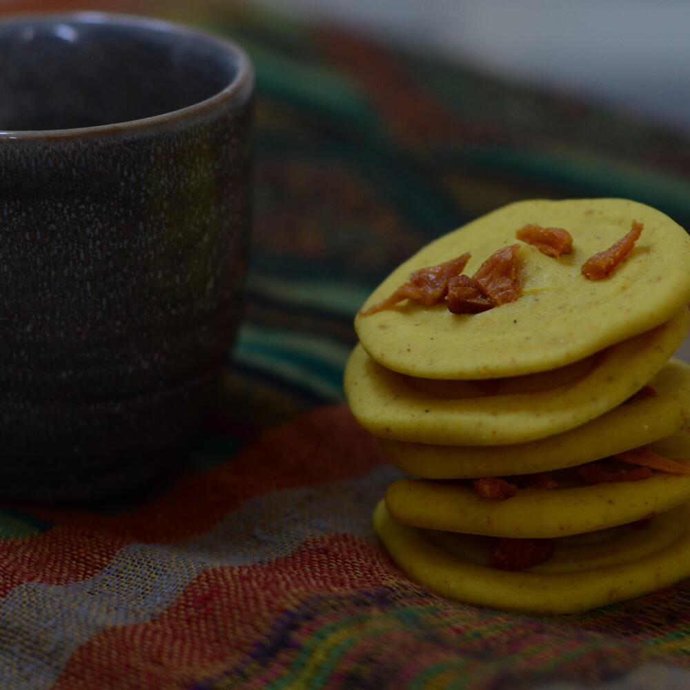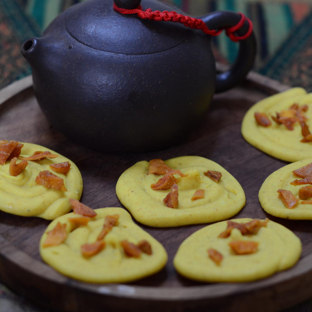 White chocolate, turmeric, curry, cinnamon, cardamom, dried mango.