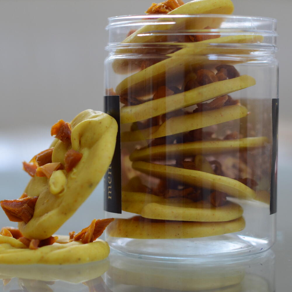 A gift that surprises at first sight and with the first bite. Our mediants are mini-masterpieces of velvety white chocolate, created by hand and flavored with a golden blend of oriental spices: turmeric, curry, cinnamon and cardamom. Each median is decorated with dried mango on top, which gives a light crunch and reveals the warm aroma of spices even more vividly. The taste is warm, warming, harmonious: - the sweetness of white chocolate - mild cinnamon spice - citrus-floral notes of cardamom - spicy curry accent - slight earthy taste of turmeric Together they create an unusual, deep and sunny taste. For whom: ✔ for those who like unusual desserts ✔ for connoisseurs of oriental spices ✔ a great gift for gourmets ✔ perfect for tea, coffee Handmade from Israel Each median is hand-cast, neatly decorated and packaged with care. We create chocolate in small batches so that it is always fresh, fragrant and as tasty as possible.