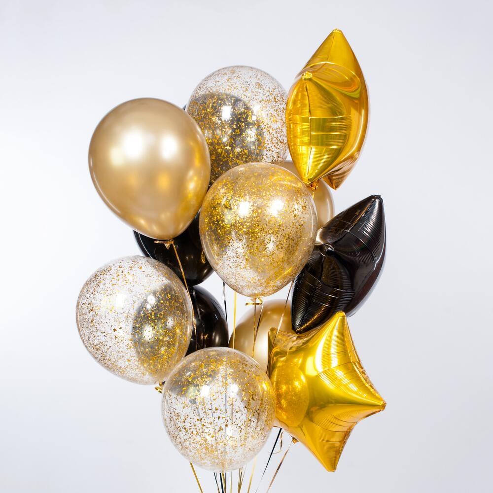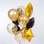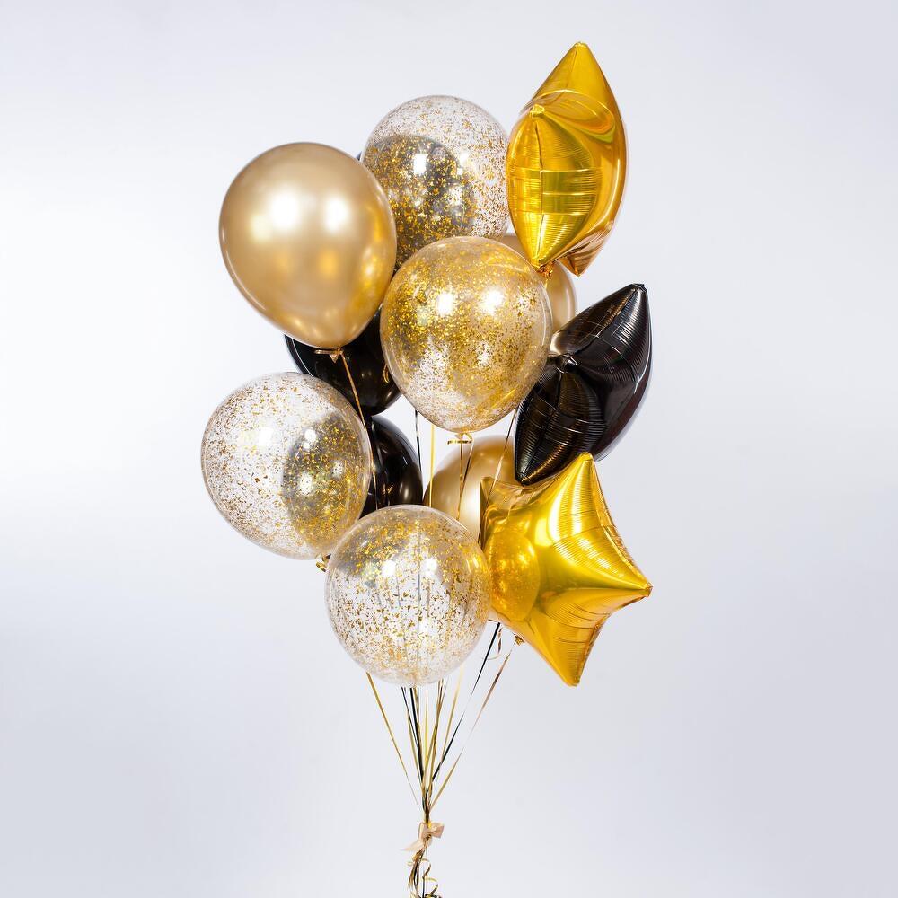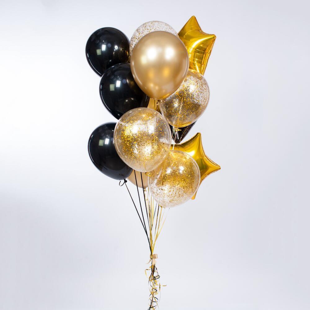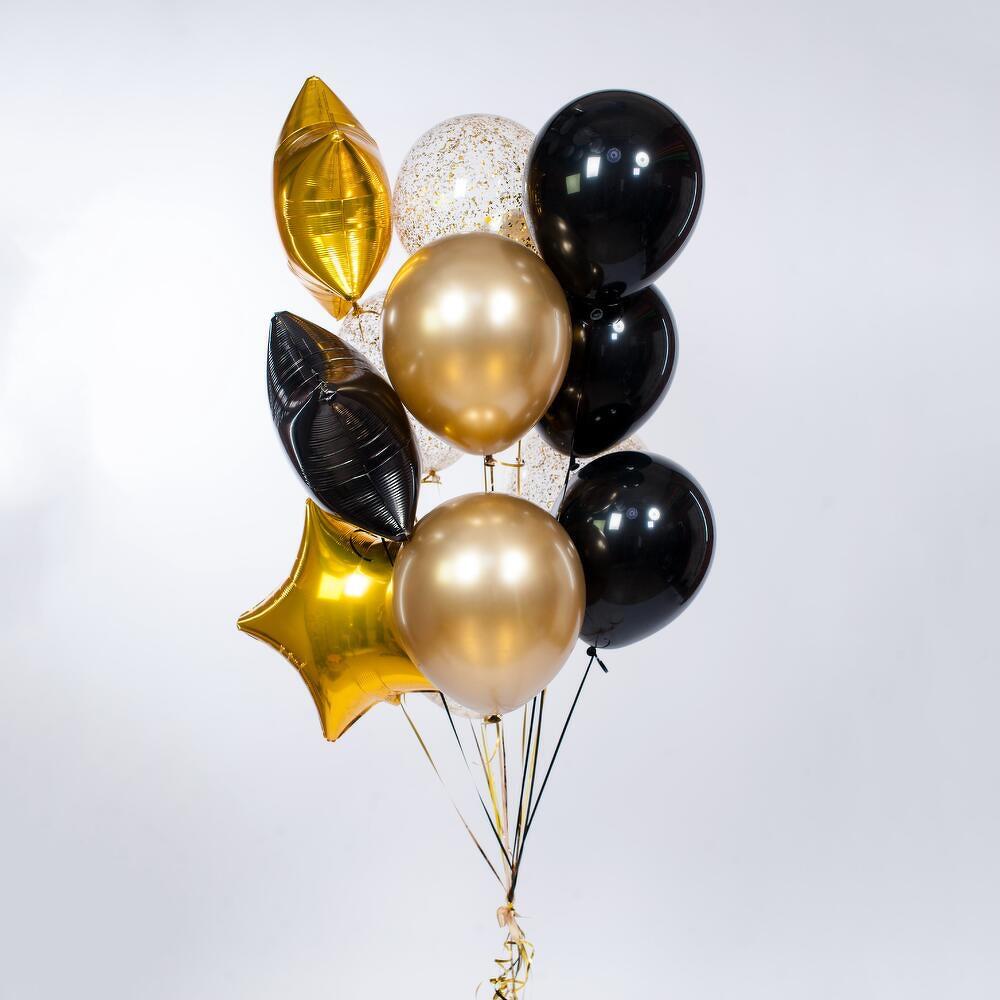 Универсальная композиция, подходящая для любого праздника и возраста) 13 шаров (фольгированные и латексные) с обработкой для длительного полета, увеличенного диаметра 35см (14 дюймов), собранные в фонтан на грузик. Доставляются в специальном транспортировочном пакете. Комплектация: 3 звезды (2 золотых, 1 чёрная) 4 шара с конфетти золото 3 золотых шара хром 3 чёрных шара
