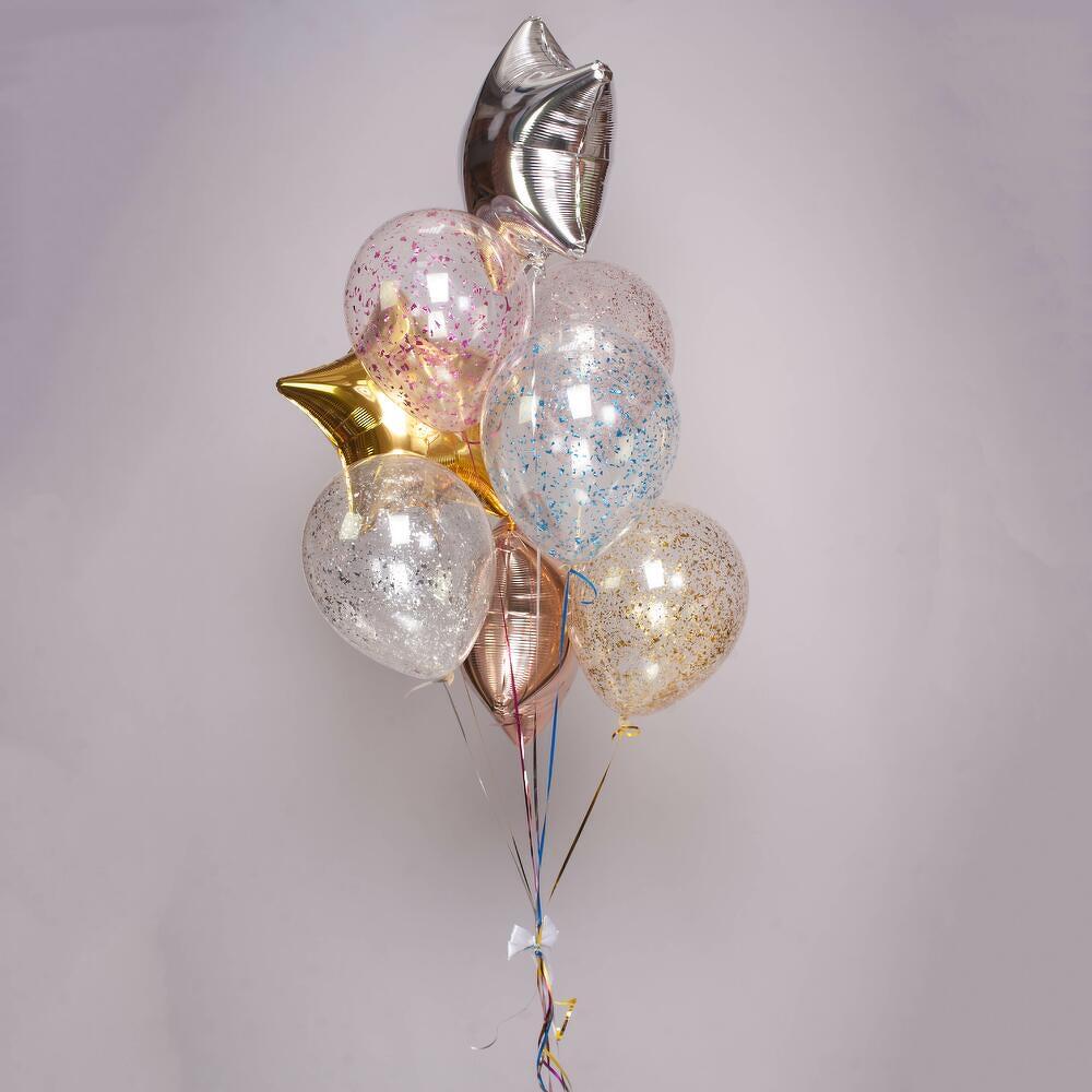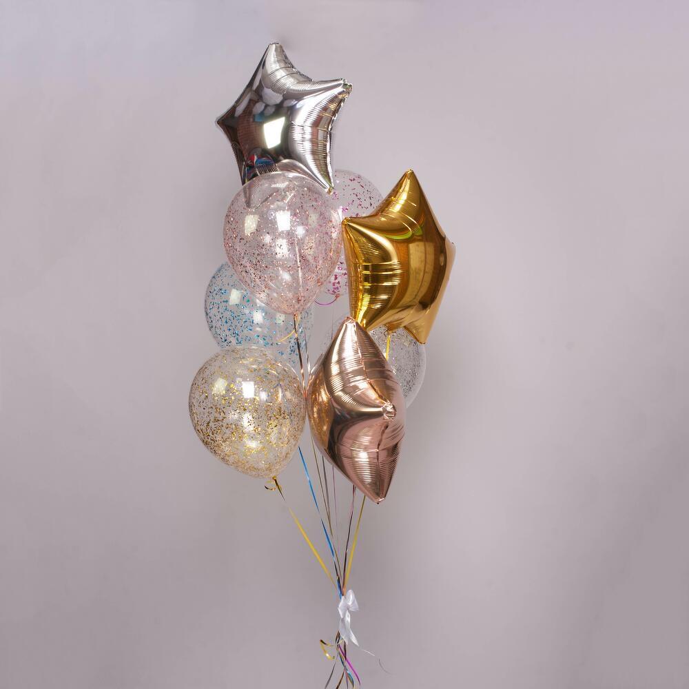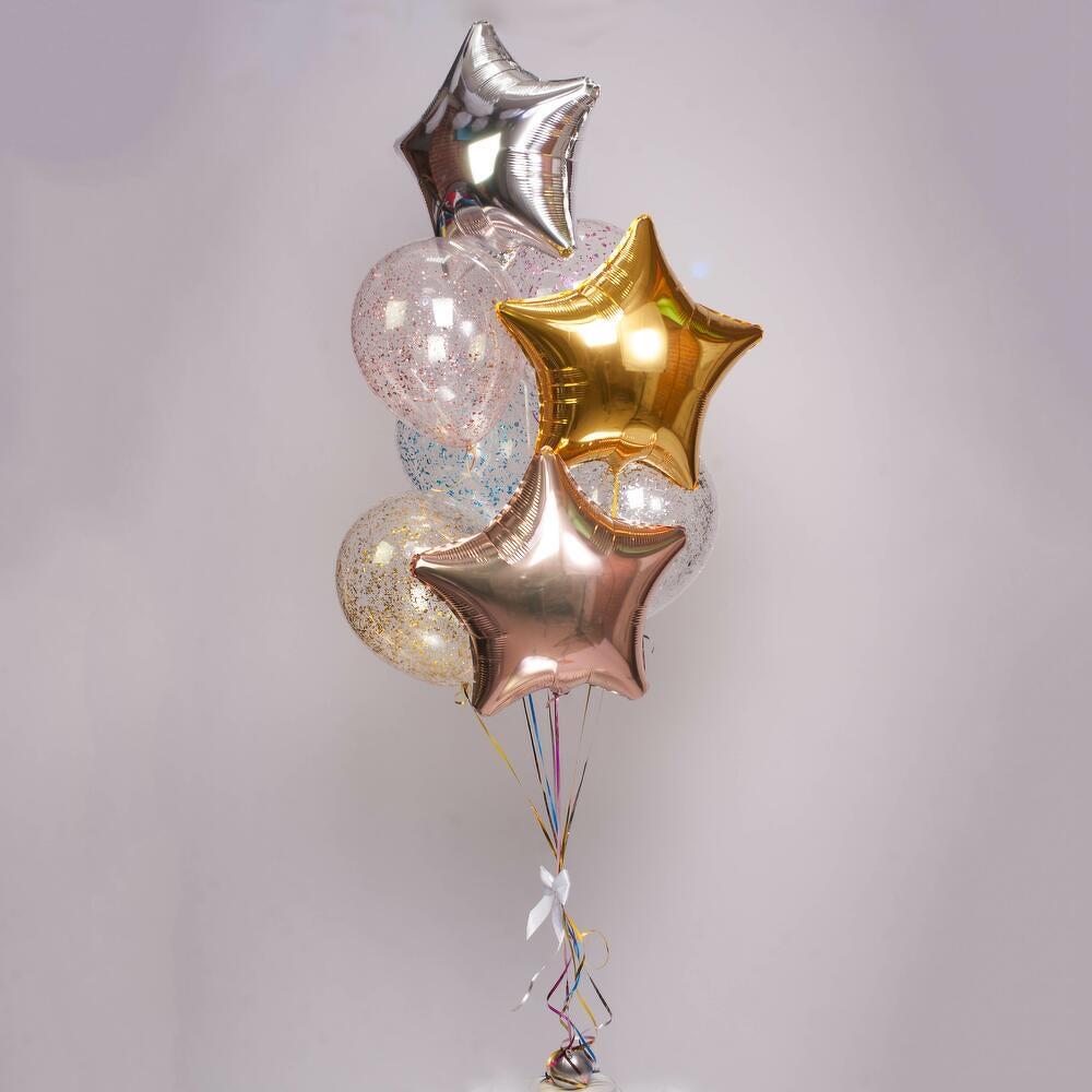Универсальная композиция, подходящая для любого праздника и возраста) 8 шаров (фольгированные и латексные) с обработкой для длительного полета, увеличенного диаметра 35см (14 дюймов), собранные в фонтан на грузик. Доставляются в специальном транспортировочном пакете. Комплектация: 1 звезда золото 1 звезда серебро 1 звезда розовое золото 1 шар с конфетти золото 1 шар с конфетти серебро 1 шар с конфетти розовое золото 1 шар с конфетти розовый 1 шар с конфетти голубой