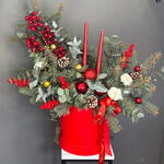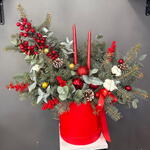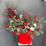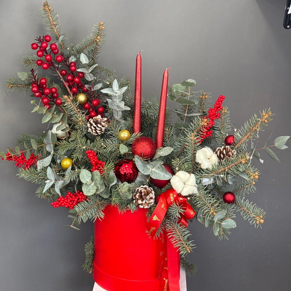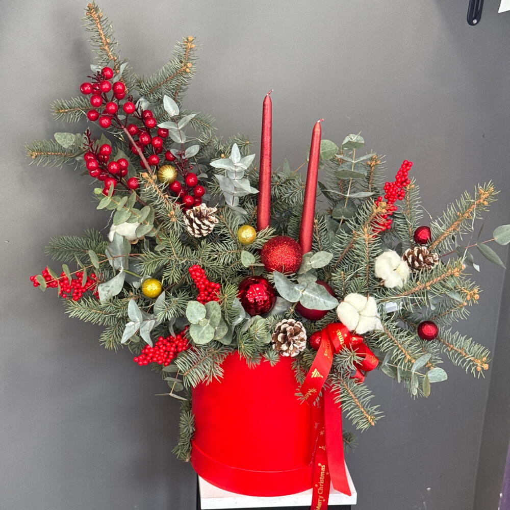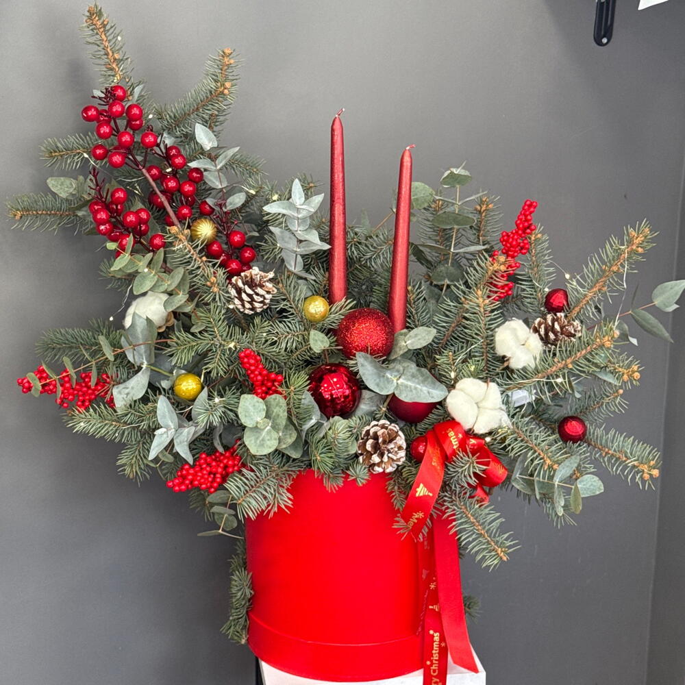 Хлопок - 3 шт. Эвкалипт - 7 шт. Коробка - 1 шт. Атласная лента - 2 шт. Илекс Красный - 7 шт. Нобилис - 4 шт. Новогодние шары - 9 шт. Свеча новогодняя - 2 шт. биофлор - 2 шт. Шишка Ели - 3 шт. света новогодняя - 1 шт.