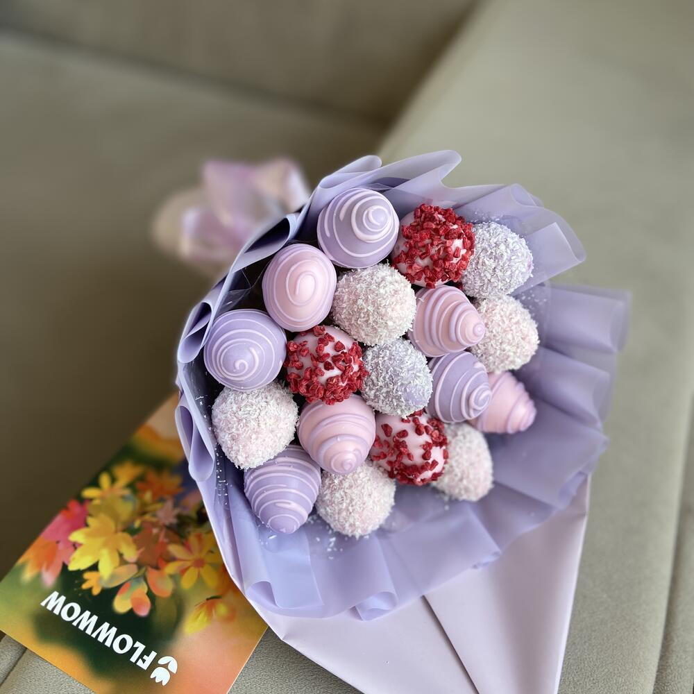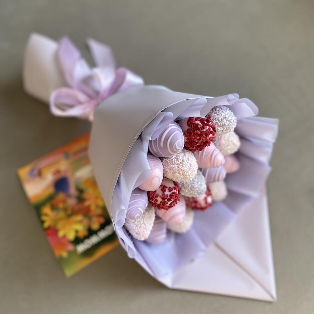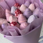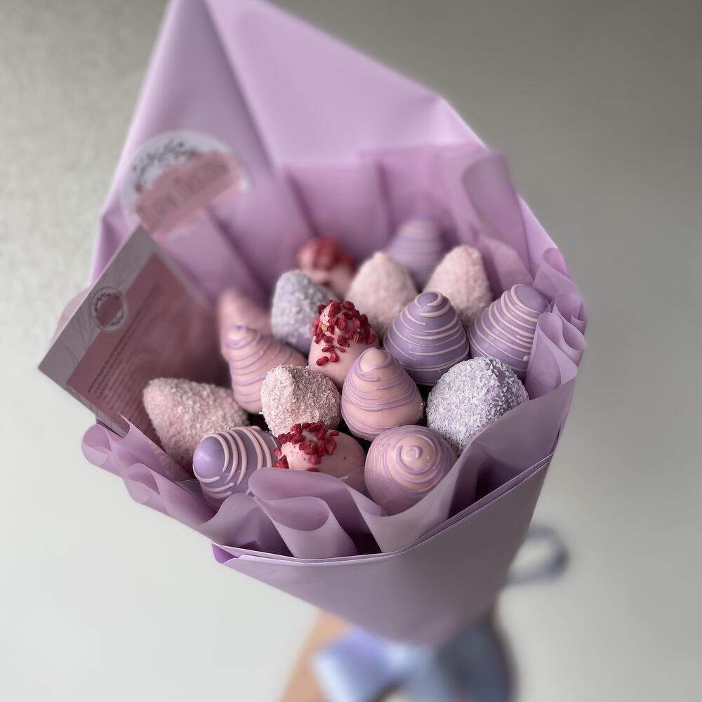 Атласная лента - 1 шт. Упаковка дизайнерская - 7 шт. Клубника в шоколаде - 17 шт.