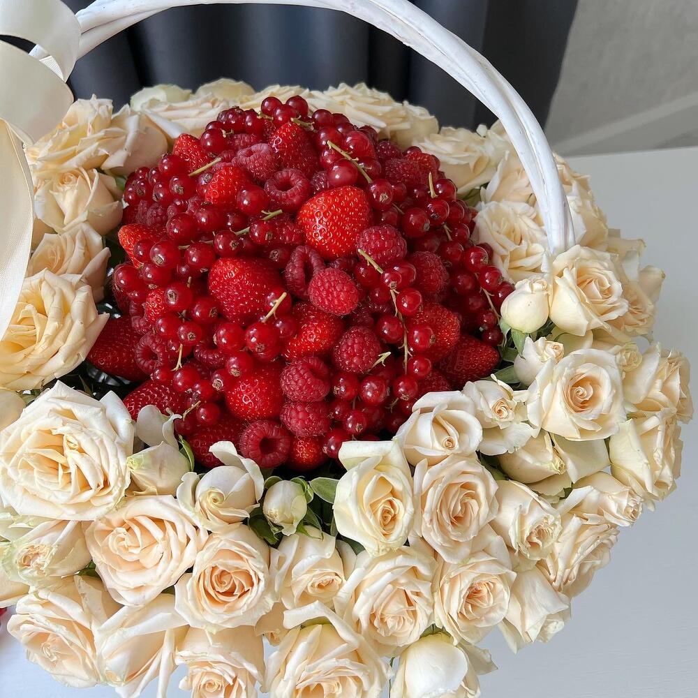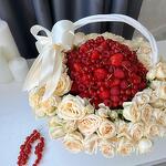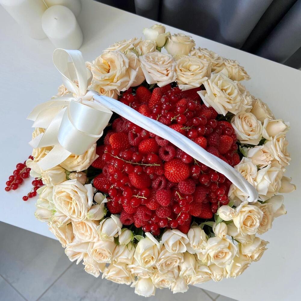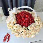 wicker basket - 1 шт. bush rose - 20 шт. fresh strawberries - 1000 гр. raspberry 125 g. - 2 шт. red currants in season - 10 шт.