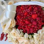 Berry basket: strawberries, raspberries and red currants (in season) with the addition of bush roses