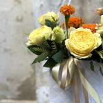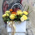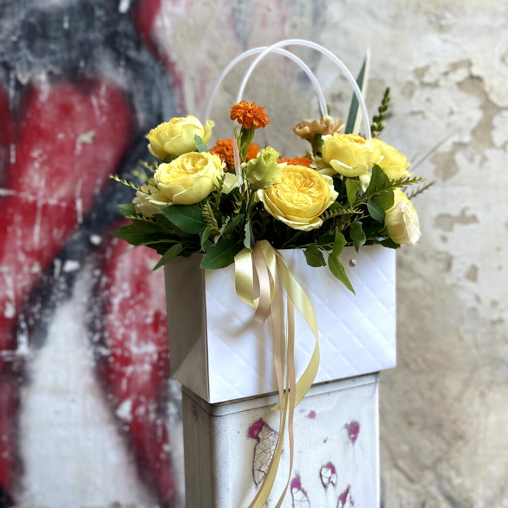 Эта элегантная цветочная композиция в сумочке наполнена солнечным светом и нежностью. 🌼 Жёлтые и кремовые розы с добавлением бархатцев создают ощущение уюта и лёгкого праздника, а свежая зелень эвкалипта добавляет композиции свежести и объёма. Цветы не имеют сильного аромата и подойдут даже для чувствительных людей. Чтобы букет дольше оставался свежим, достаточно поддерживать влажность губки внутри сумочки — и он будет радовать глаз до 10 дней.