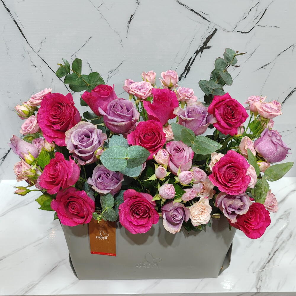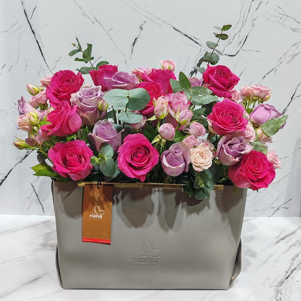 Nice flowers arranged on a leather bag. Foosiya red, pink spray roses and purple roses together with eucalyptus icalyptus