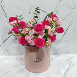 Foosiya red roses and pink spray roses arranged in a nice pink round flower box