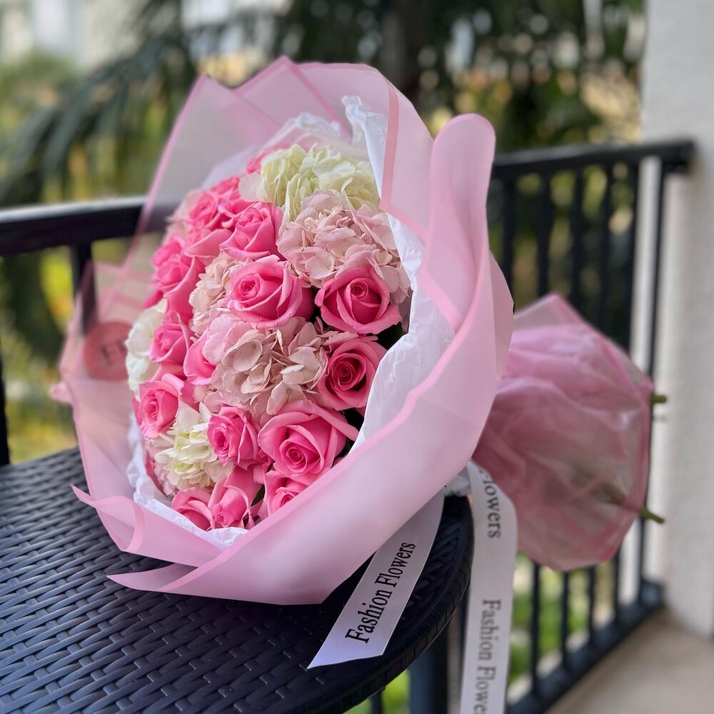Роза - 25 шт. Гортензия розовая - 7 шт.