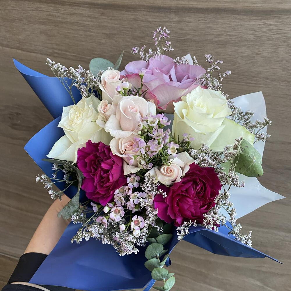 Spray rose - 1 шт. Limonium - 2 шт. carnation - 2 шт. wax - 1 шт. wrapping paper - 2 шт. roses - 3 шт. sponge - 1 шт.